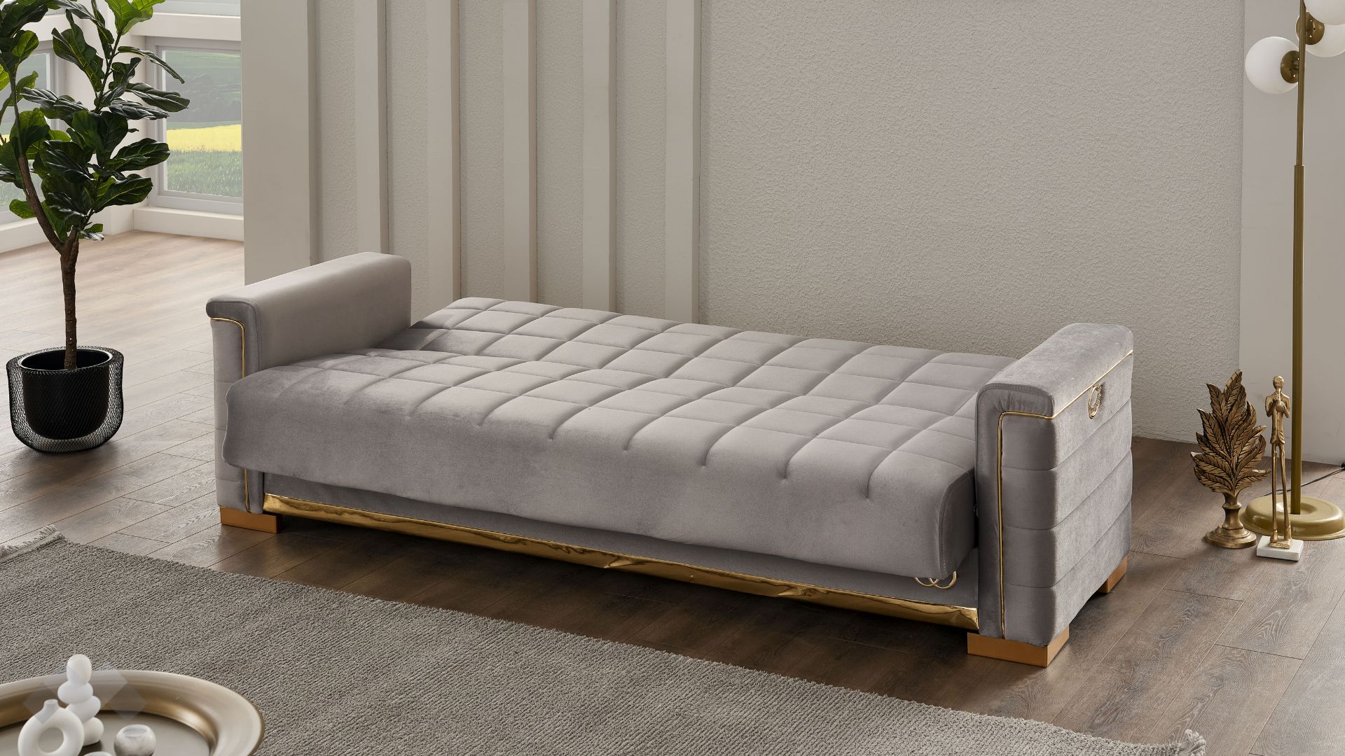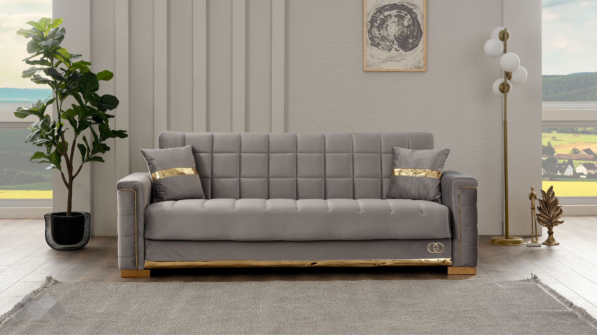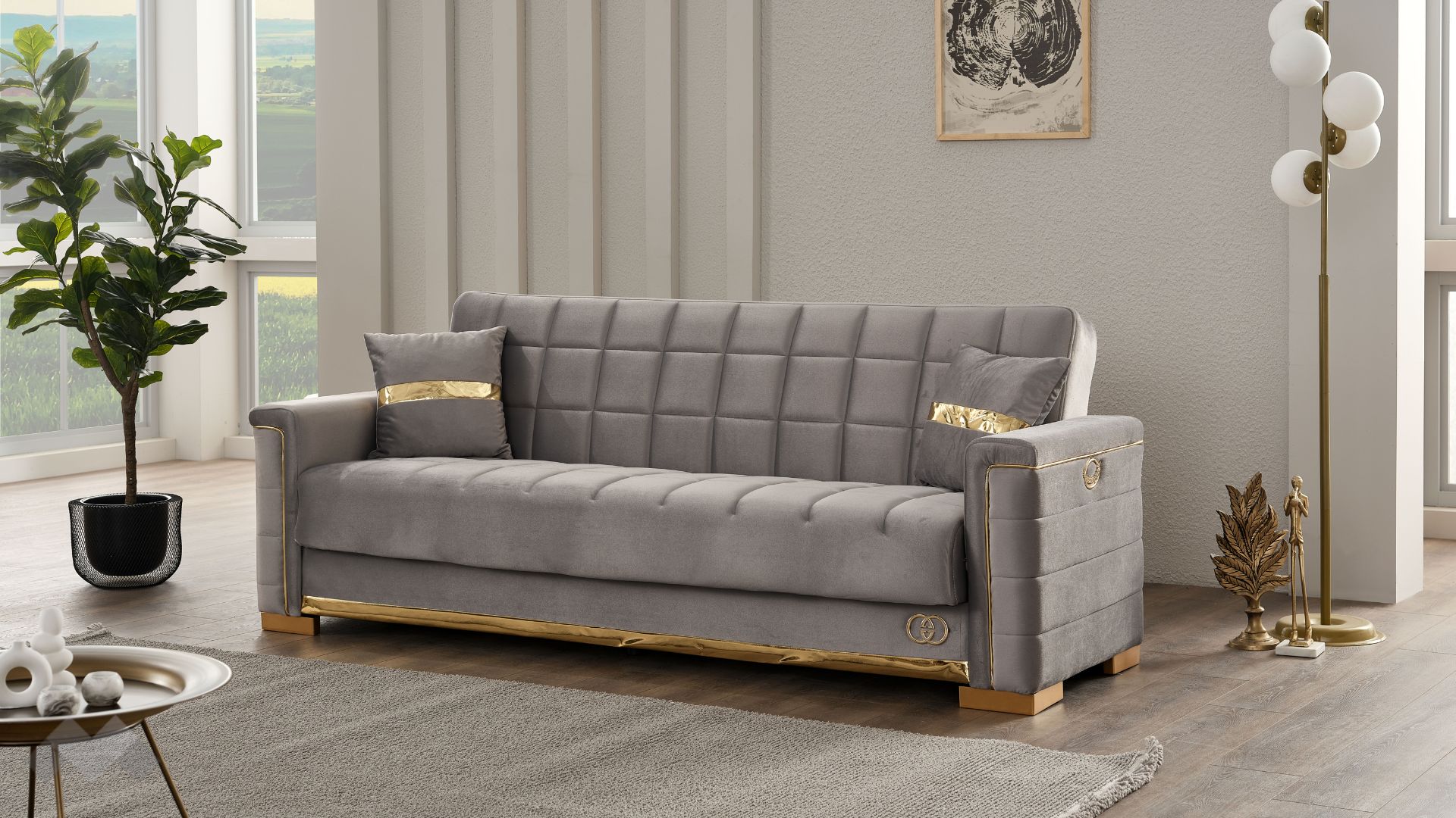 Диван Агра впечатлява с елегантност, изчистени линии и стилна визия. Подлакътниците, обкантени с декоративен златен кант и крака в златно, в комбинация с фигуралните шевове по дамаската и умело подбрания ѝ цвят, го превръщат в истинско интериорно бижу.