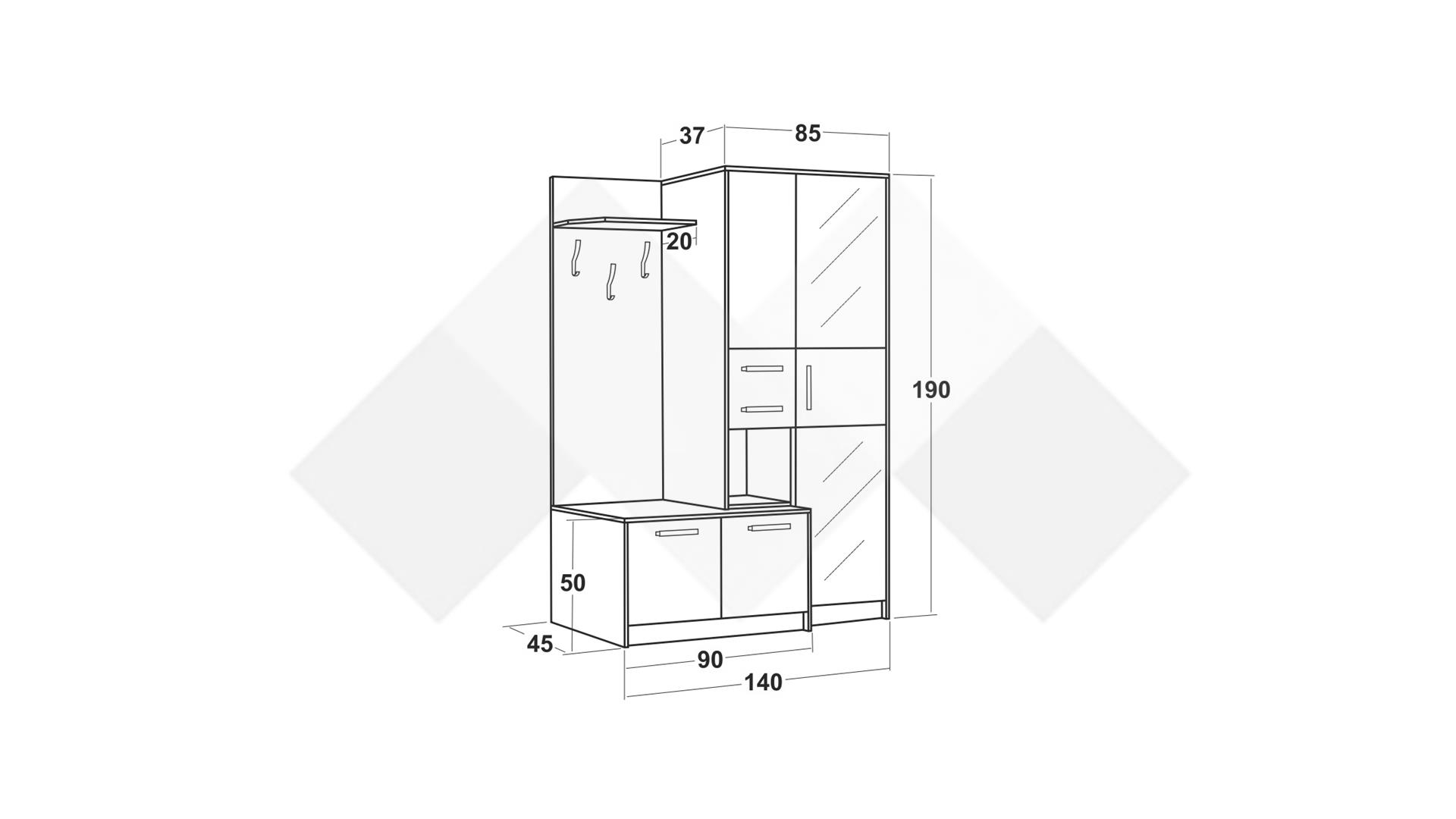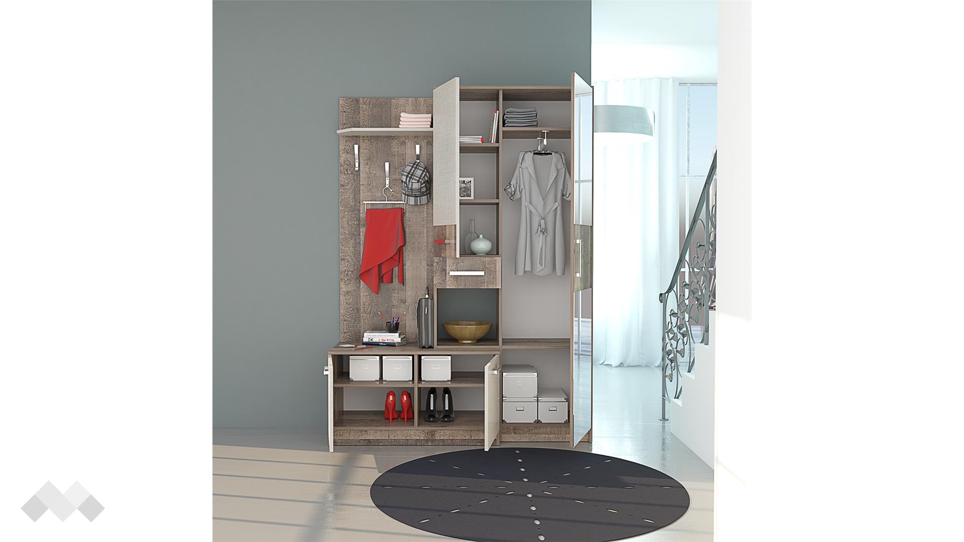 Портманто Алберто разполага с еднокрилен гардероб с два рафта и лост за закачалки. Там ще откриеш достатъчно място за палта, по-обемни връхни дрехи, шапки, чадъри и кутии за съхранение. Голямото огледало по цялата дължина на вратата на гардероба ще ти даде възможност да се огледаш в цял ръст преди да излезеш. Щом отвориш двете вратички на затворения шкаф ще видиш два рафта, където можеш да прибереш любимите обувки, които носиш често. Отвореният шкаф е идеално място за аксесоари или красиви декорации. Над него са позиционирани чекмедже и шкаф с вратичка, зад която се крият два рафта. Там можеш да организираш необходимите за ежедневието вещи, които да ти бъдат винаги под ръка. На паното са монтирани три здрави закачалки за якета, палта, шалове и шапки. Рафтът в горната част е удобен за малки кутии, аксесоари или други необходими за теб неща.
