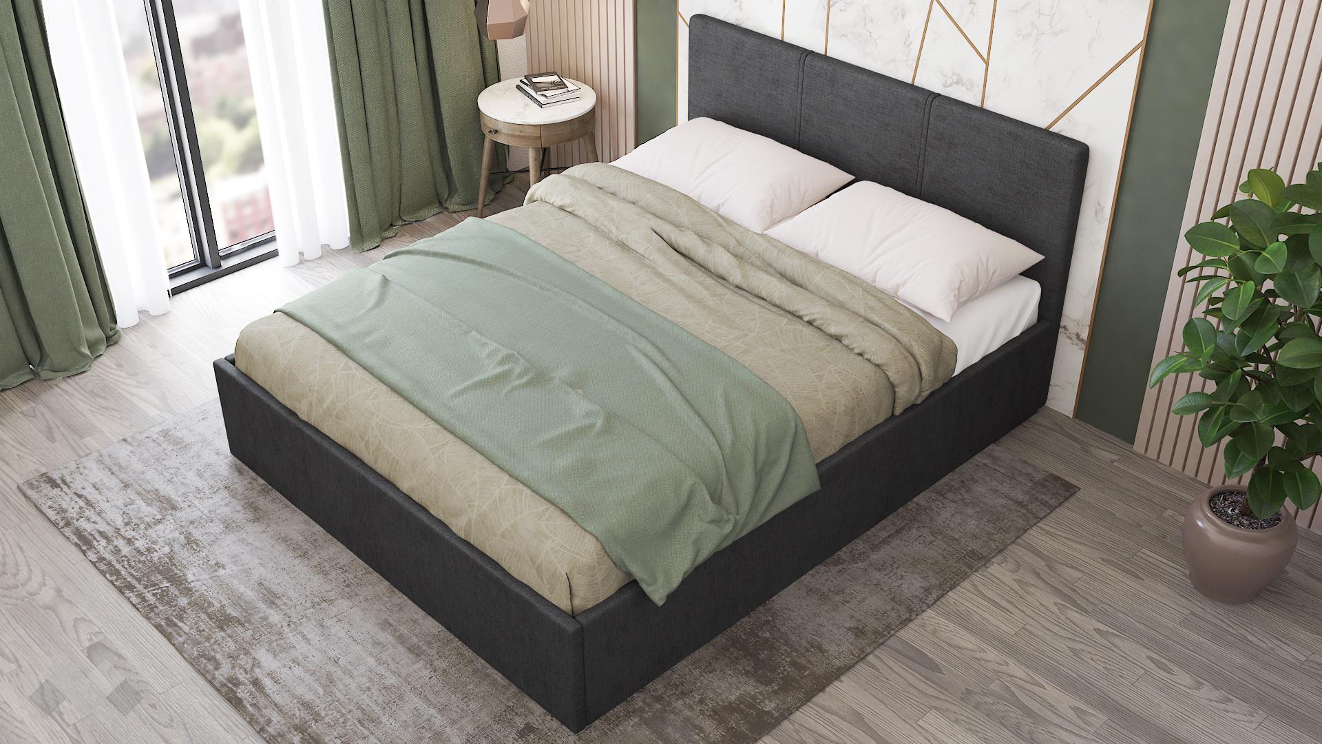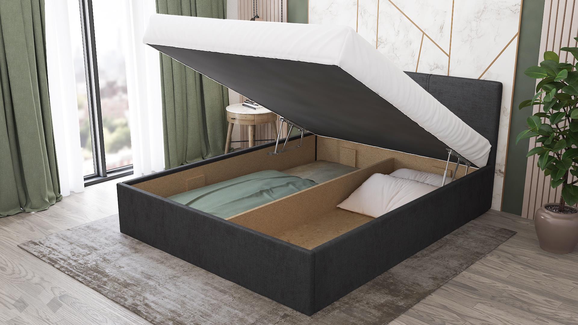 Тапицирана спалня Алекса е с идеалните размери – подходяща е за матрак с размер 160/200 см. С повдигането на матрака пък се открива широко пространство, готово да побере всички възглавници и завивки, на които все не се намира място. Допълнителният делител на подматрачното пространство прави организацията на вещите още по-лесна.
