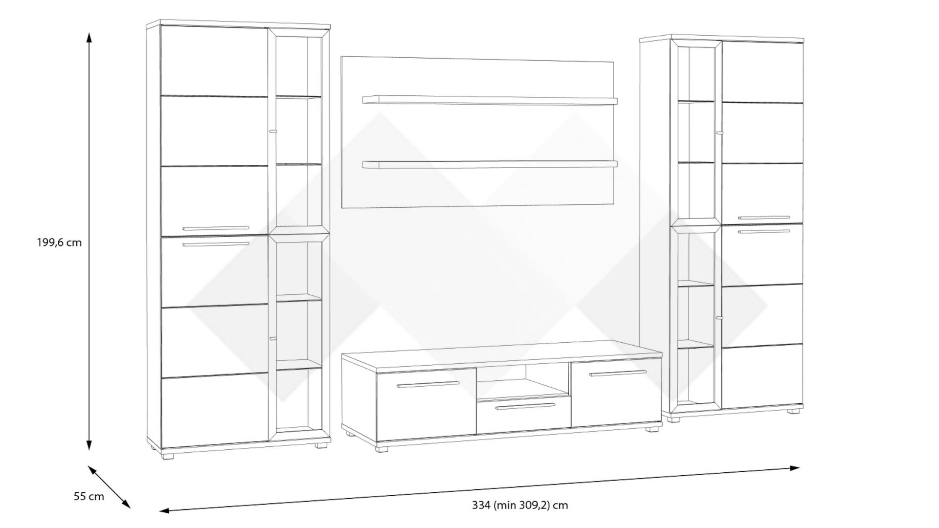 Секцията Алистър е проектирана така, че да предлага изключително разнообразие от възможности за съхранение. С дължина от 334 см, тя е снабдена с практични шкафове, открити рафтове и витрини – идеални за съхранение на книги, ценни сувенири, аудио и видео техника и всичко, което желаете да подредите на видно място. Централното място за телевизор е с размер 149.4 см, предоставяйки простор и удобство за гледане. Високият шкаф и етажерките позволяват съхранение и на по-обемни предмети, като същевременно придават завършен вид на модела.