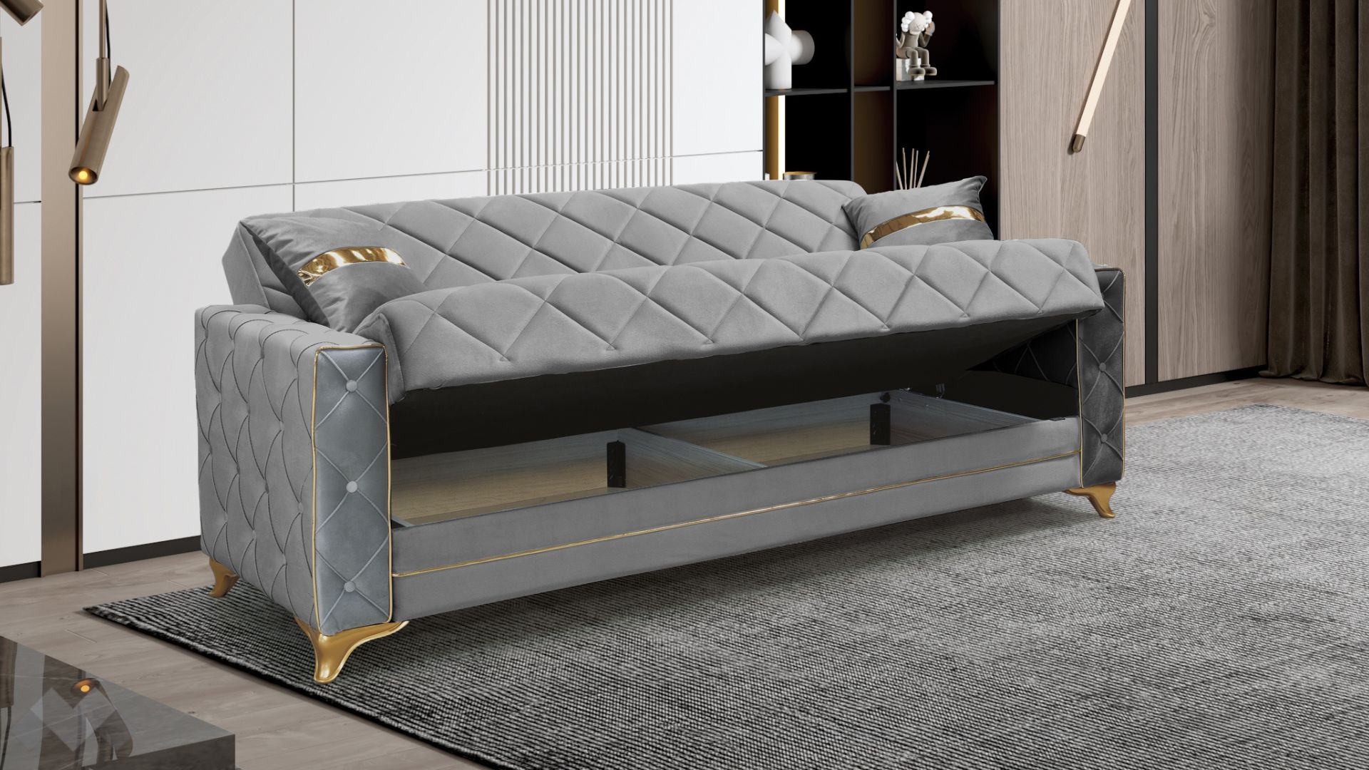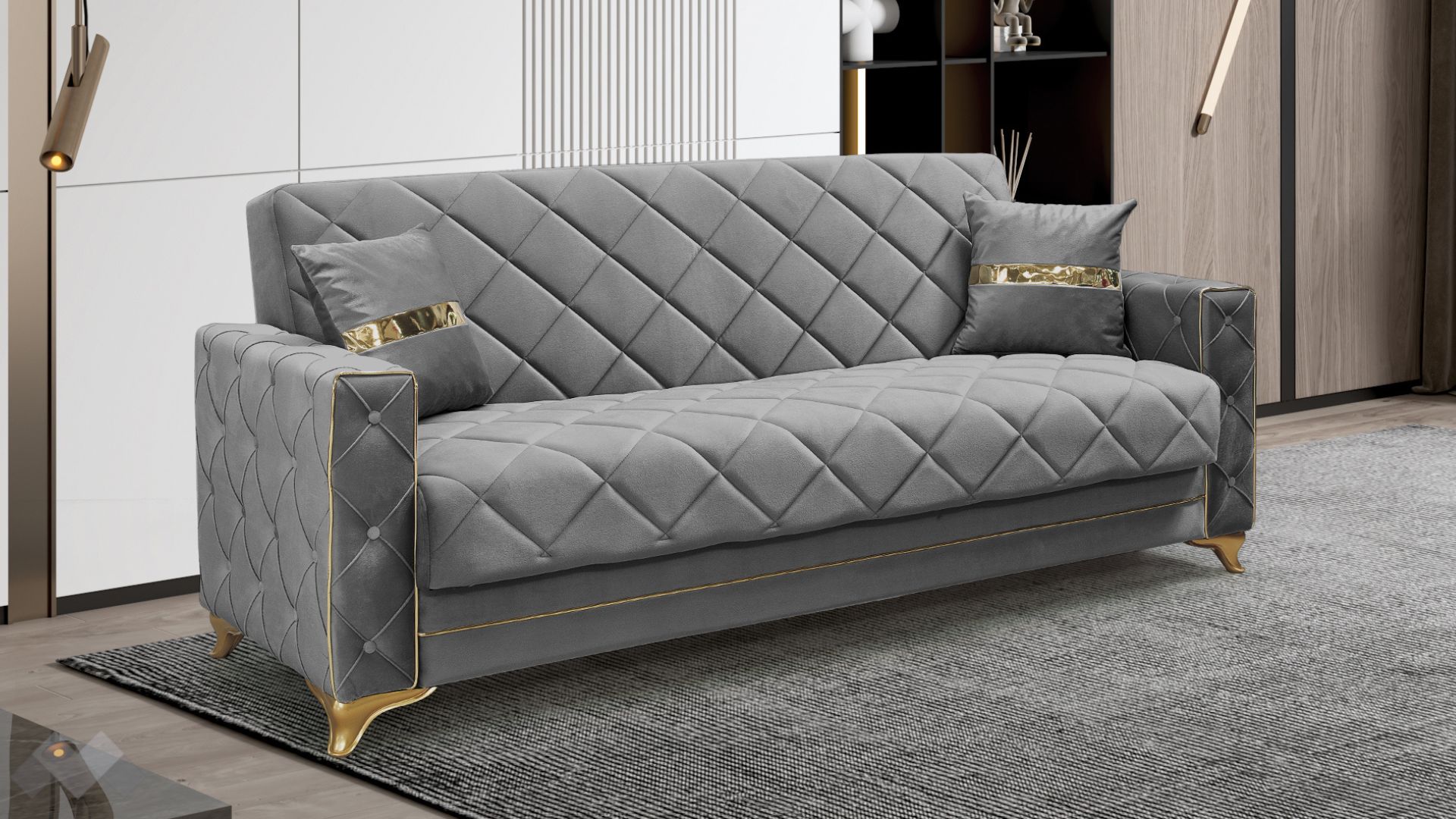 Диван Алмере впечатлява с елегантност, изчистени линии и стилна визия. Подлакътниците, обкантени с декоративен златен кант и крака в златно, в комбинация с фигуралните шевове по дамаската и умело подбрания ѝ цвят, го превръщат в истинско интериорно бижу.