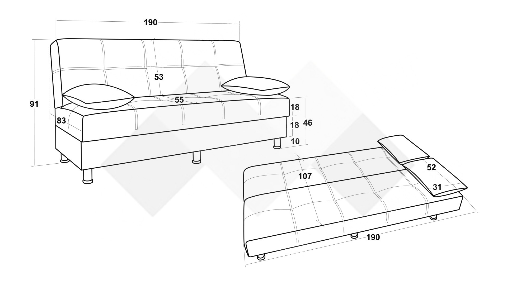 Моделът е изключително комфортен. Благодарение на пружинния пакет Бонел, вложен в канапето, ще усетиш леко потъване при сядане и по-голяма мекота при ползване на функция сън. Освен удобно, канапето е и функционално - с минимално усилие, за миг се превръща в легло посредством клик-клак механизъм, а под седалката се крие просторна ракла, където да съхраняваш завивки, възглавници и други вещи. Дори да не разпънеш канапето, когато махнеш възглавниците, площта му става с размерите на единично легло и можеш спокойно да се отпуснеш за следобедна дрямка.