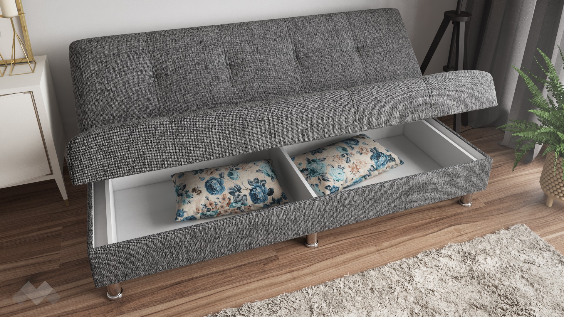 Моделът е изключително комфортен. Благодарение на пружинния пакет Бонел, вложен в канапето, ще усетиш леко потъване при сядане и по-голяма мекота при ползване на функция сън. Освен удобно, канапето е и функционално - с минимално усилие, за миг се превръща в легло посредством клик-клак механизъм, а под седалката се крие просторна ракла, където да съхраняваш завивки, възглавници и други вещи. Дори да не разпънеш канапето, когато махнеш възглавниците, площта му става с размерите на единично легло и можеш спокойно да се отпуснеш за следобедна дрямка.
