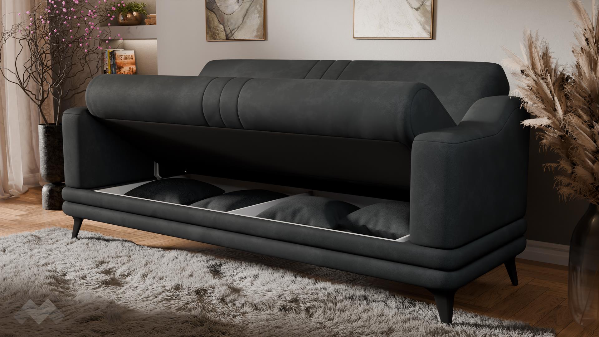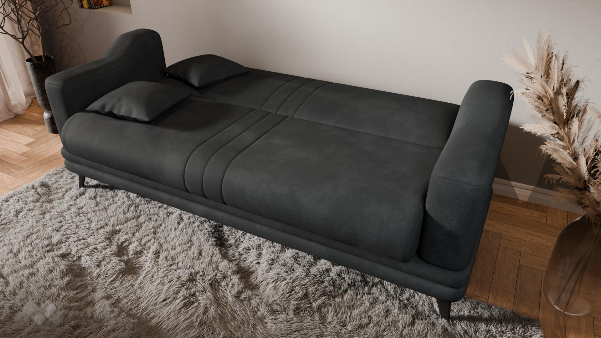 Диванът разполага с функция сън с размер 110/180 см, която бързо и лесно го превръща в удобно легло - идеално както за ежедневна употреба, така и за гости. Благодарение на практичната ракла за съхранение, можеш удобно да подредиш одеяла, възглавници и спално бельо, без да заемаш допълнително място в стаята.