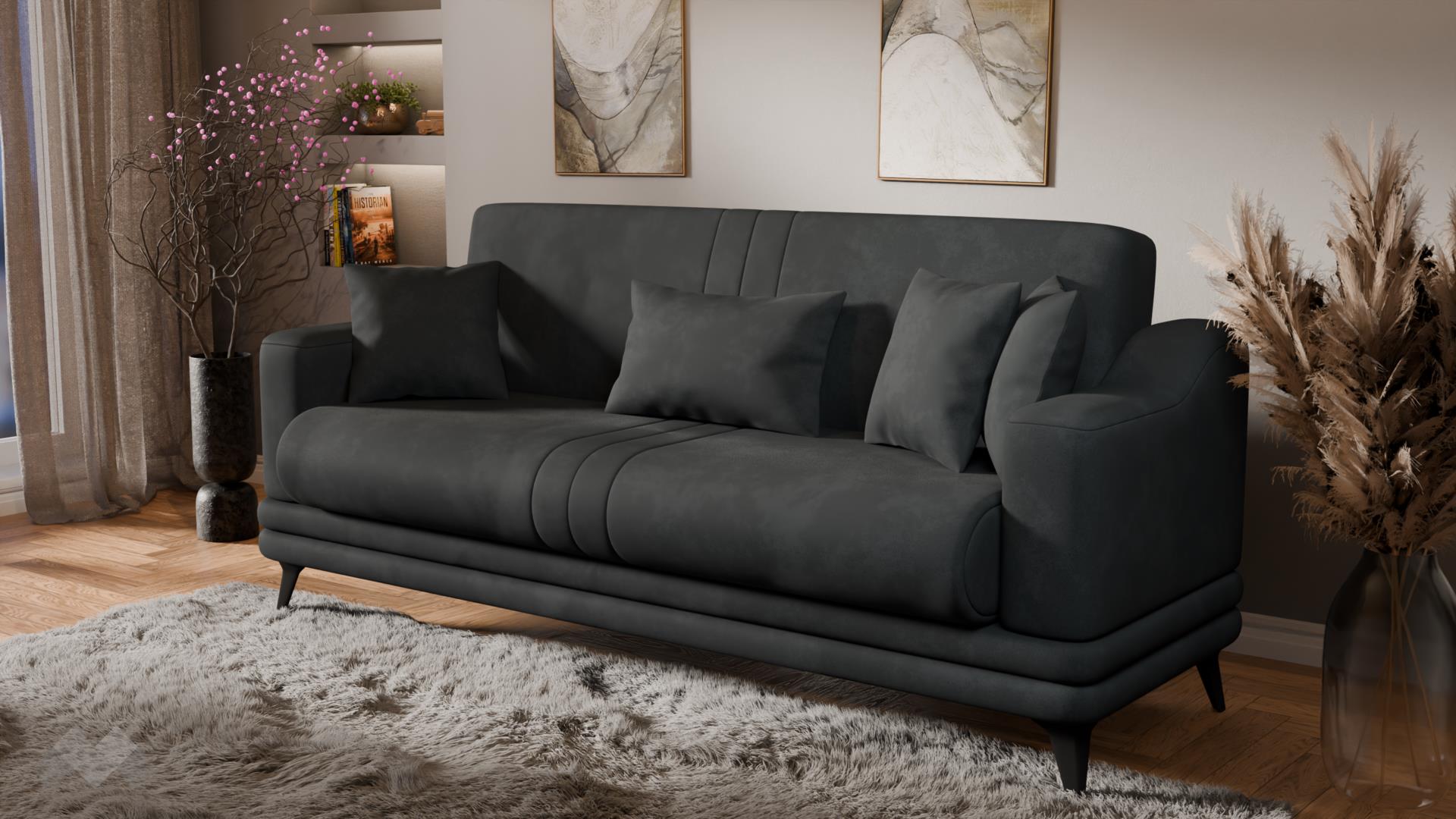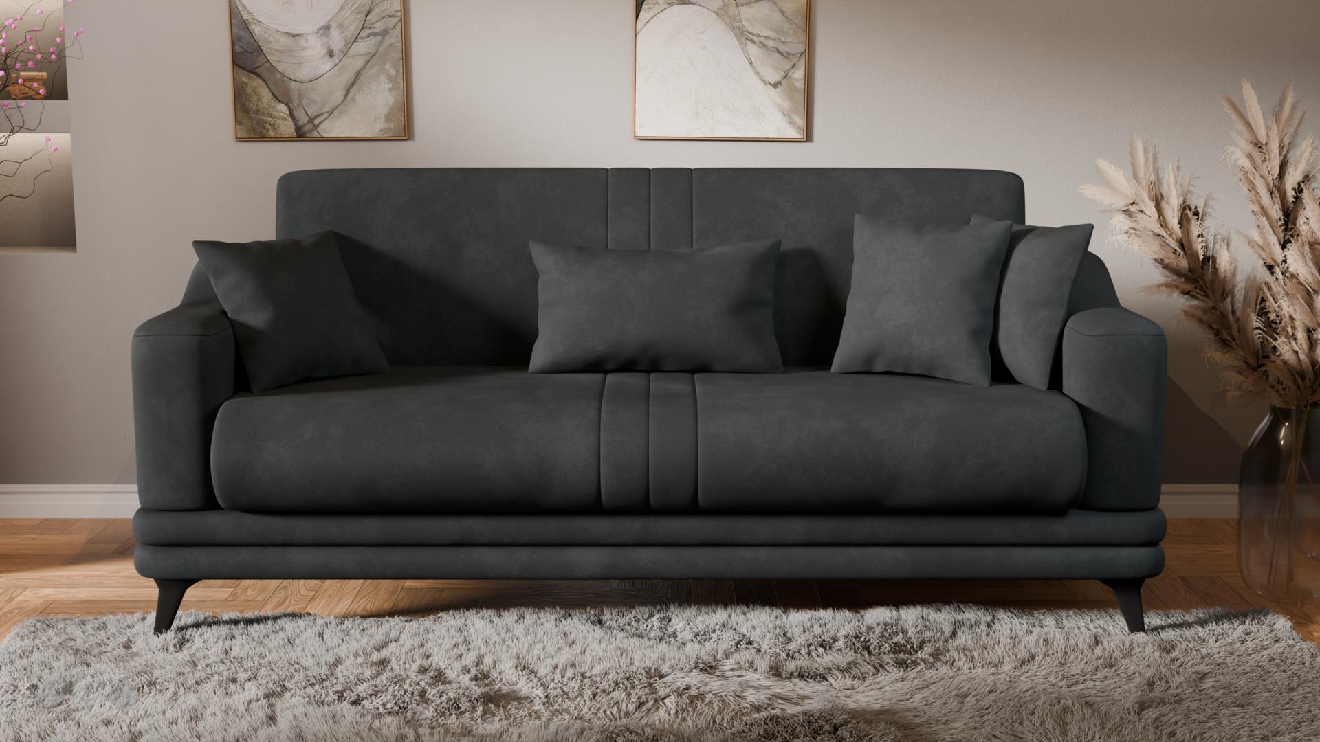 Моделът е триместен и изключително практичен, подходящ както за всекидневна, така и за гостна стая. Меките възглавници и удобните подлакътници осигуряват уют при сядане, а изчистеният силует позволява лесно съчетаване с различни стилове обзавеждане.
