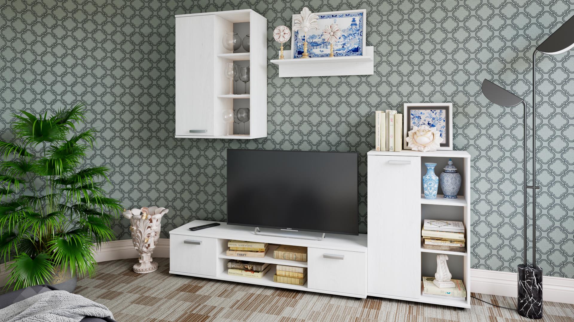 Основата на секцията представлява широк ТВ шкаф с удобен плот, два отворени рафта под него и два шкафа. Там ще откриеш достатъчно място, където да поставиш цялата си съпътстваща техника като ТВ приемници, DVD плейъри и други. До него е поставен висок шкаф с открити рафтове и врата, където с лекота ще аранжираш необходимите ти в ежедневието вещи. Окаченият шкаф също ще ти е от полза – освен да подредиш сувенири, фотоси и декорации, можеш да се възползваш и от закритата част, където да организираш дребни ел. уреди или неща, които да останат скрити от погледите. Към секцията сме добавили и практична етажерка, подходяща за подреждане на книги, скъпи спомени като фотографии или сувенири, а можеш и да аранжираш със стилни декорации и украси – изборът е твой!