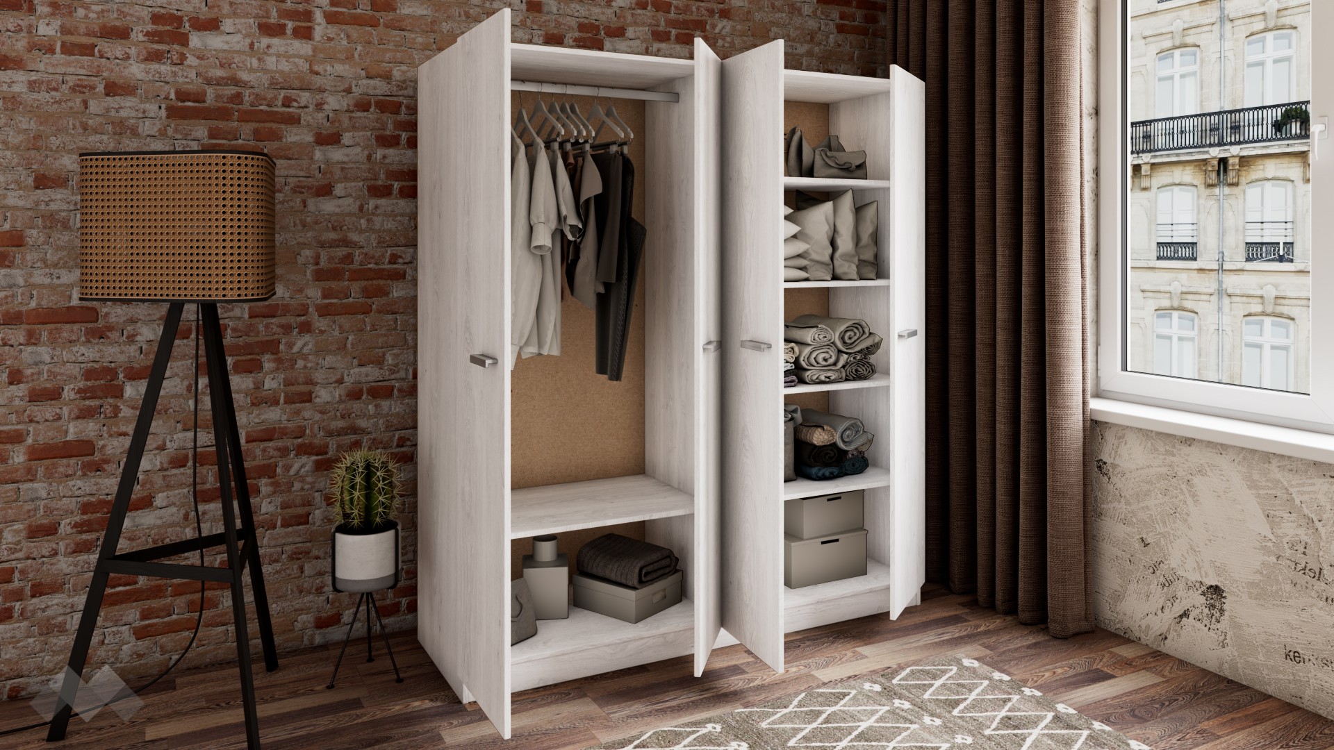 Гардеробът е практично разпределен, изцяло отговарящ на съвременните стандарти за съхранение на дрехи. Вратите се отварят леко и ти дават бърз достъп до всичко – зад две от вратите ще откриеш четири удобно разпределени просторни рафтове, готови да поберат всичките ти дрехи. Не сме забравили и лоста за закачалки, а под него е разположен удобен рафт, където да подредиш аксесоари, кутии за съхранение или други вещи. Така пестиш време и изборът на ежедневен тоалет се превръща в детска игра.