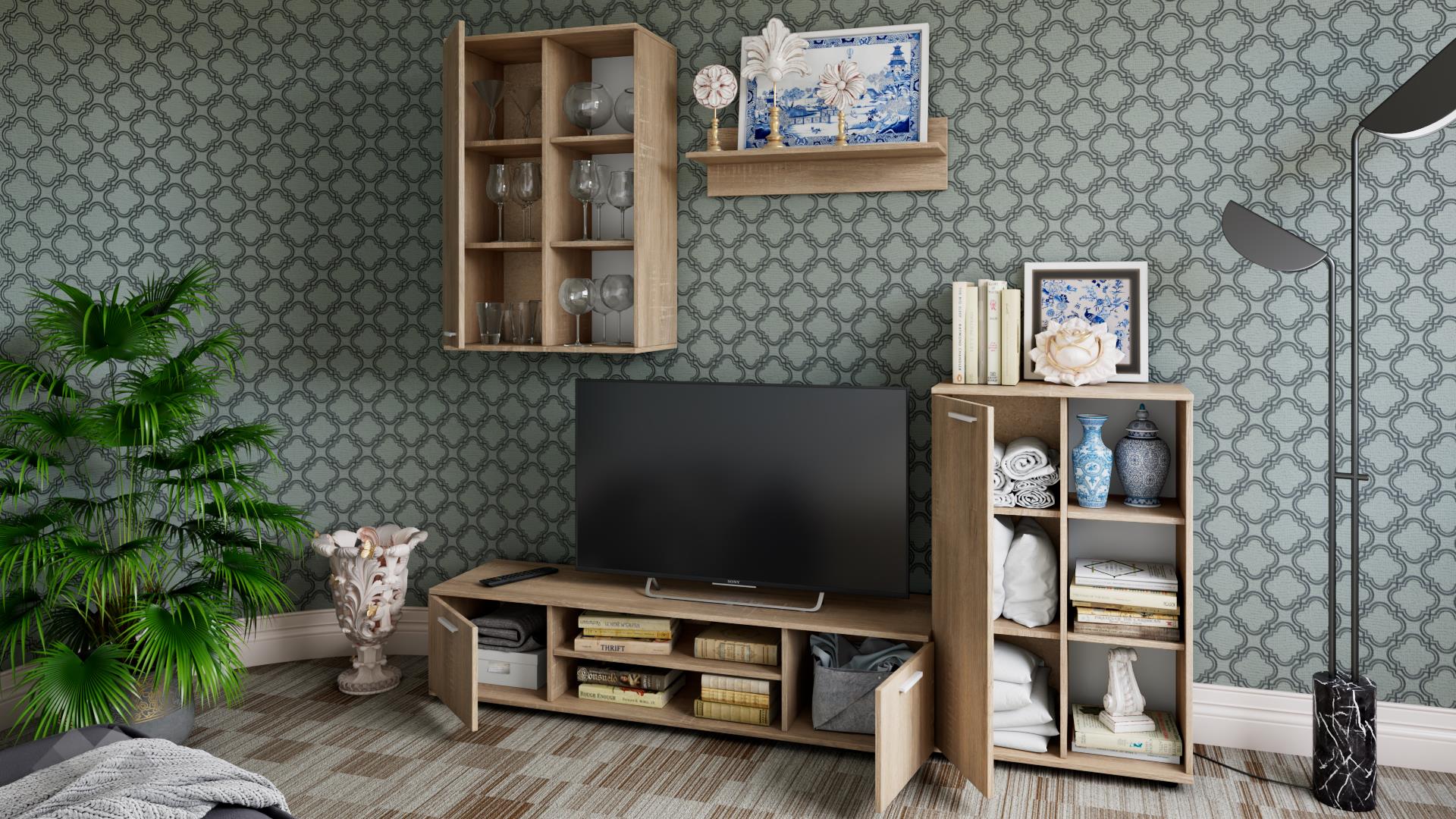 Основата на секцията представлява широк ТВ шкаф с удобен плот, два отворени рафта под него и два шкафа. Там ще откриеш достатъчно място, където да поставиш цялата си съпътстваща техника като ТВ приемници, DVD плейъри и други. До него е поставен висок шкаф с открити рафтове и врата, където с лекота ще аранжираш необходимите ти в ежедневието вещи. Окаченият шкаф също ще ти е от полза – освен да подредиш сувенири, фотоси и декорации, можеш да се възползваш и от закритата част, където да организираш дребни ел. уреди или неща, които да останат скрити от погледите. Към секцията сме добавили и практична етажерка, подходяща за подреждане на книги, скъпи спомени като фотографии или сувенири, а можеш и да аранжираш със стилни декорации и украси – изборът е твой!