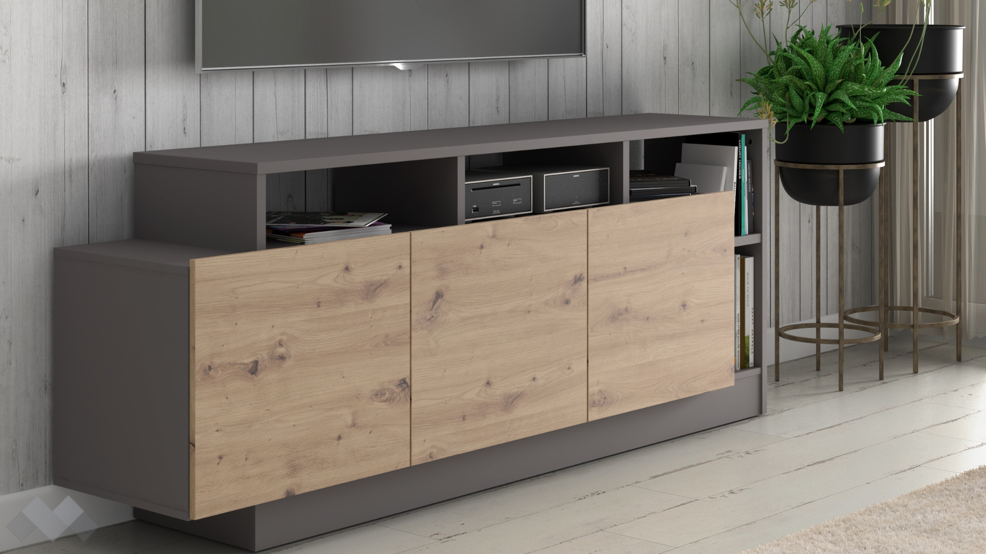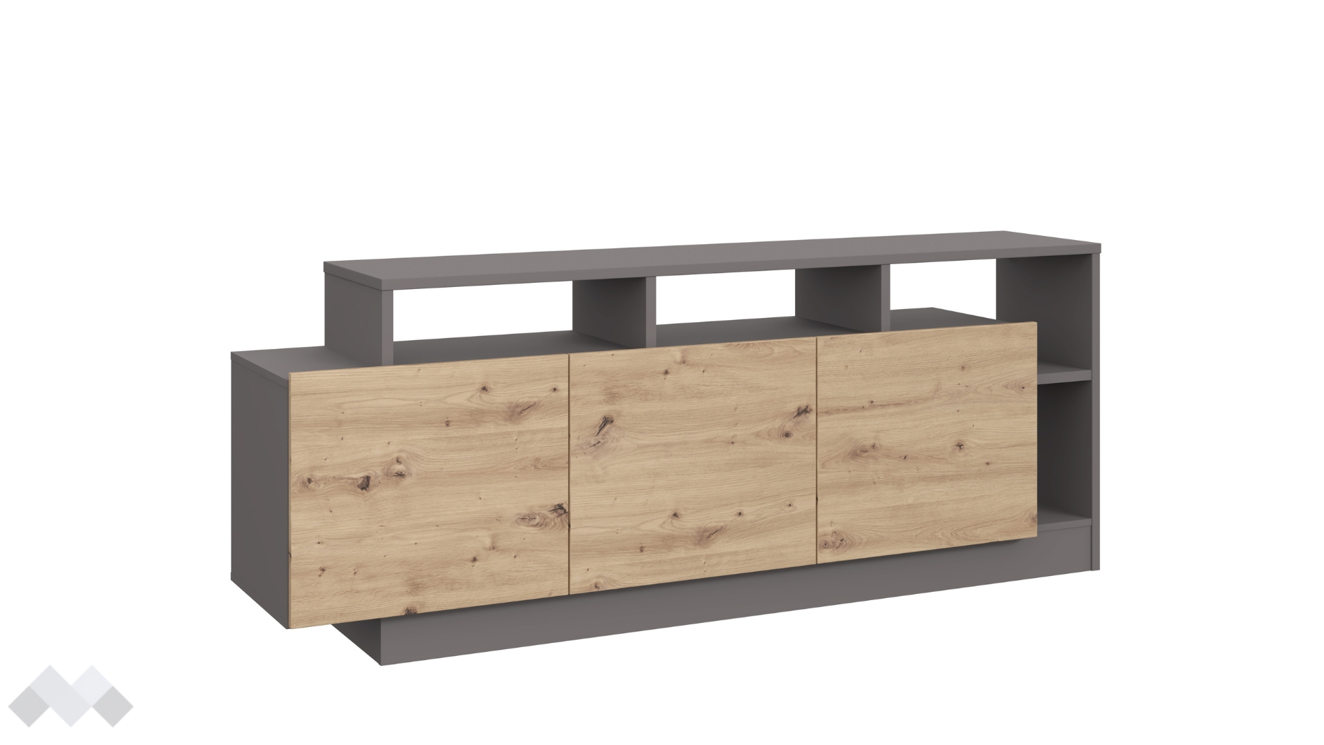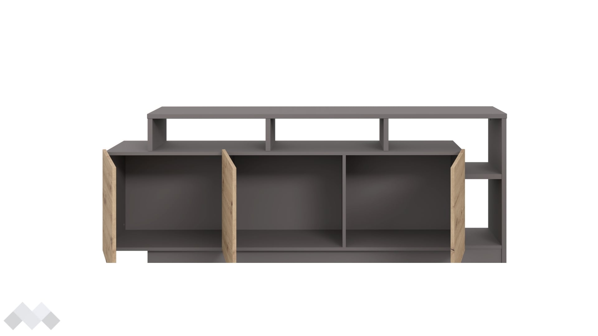 Благодарение на балансирания си дизайн и просторната горна повърхност, шкафът е подходящ за телевизори с различни размери. Семплата визия и функционалното разпределение го правят подходящ избор за модерна дневна или хол.