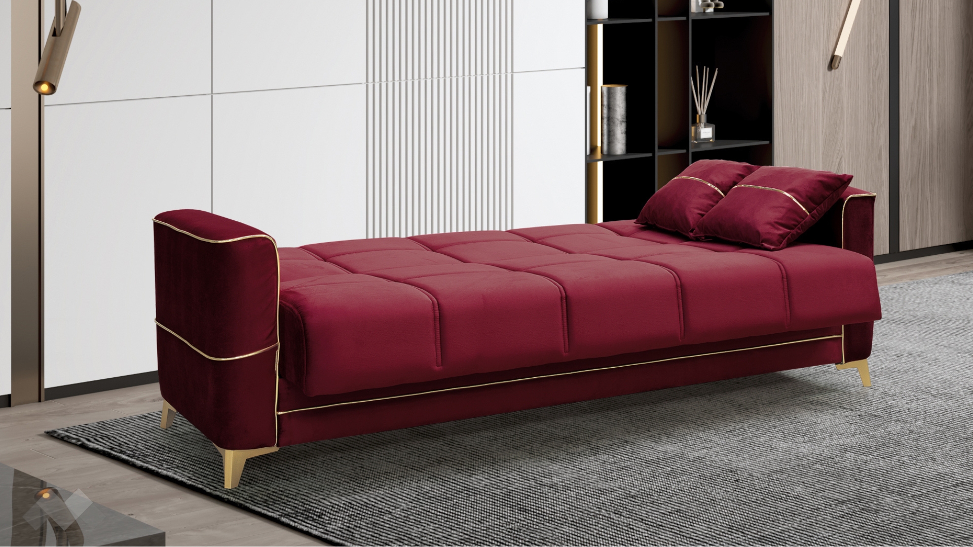 Диван Астон впечатлява с елегантност, изчистени линии и стилна визия. Подлакътниците, обкантени с декоративен златен кант и крака в златно, в комбинация с фигуралните шевове по дамаската и умело подбрания ѝ цвят, го превръщат в истинско интериорно бижу.