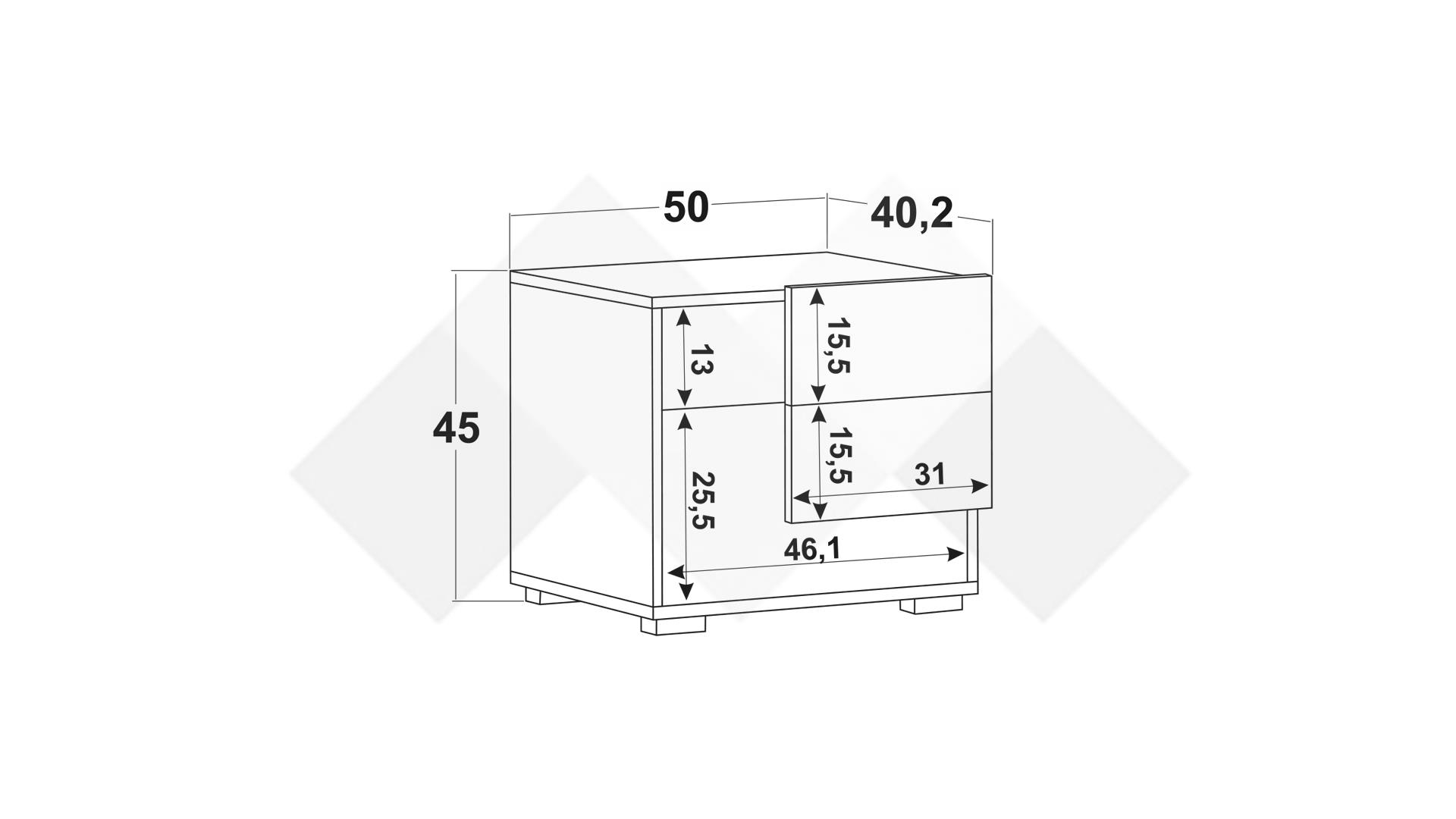 Нощен шкаф Бафра е идеален за поставяне до леглото, осигурявайки лесен достъп до всичките ти принадлежности. Шкафът разполага с две чекмеджета, които предлагат удобно пространство за съхранение на списания или други лични вещи, които искаш да бъдат на една ръка разстояние.