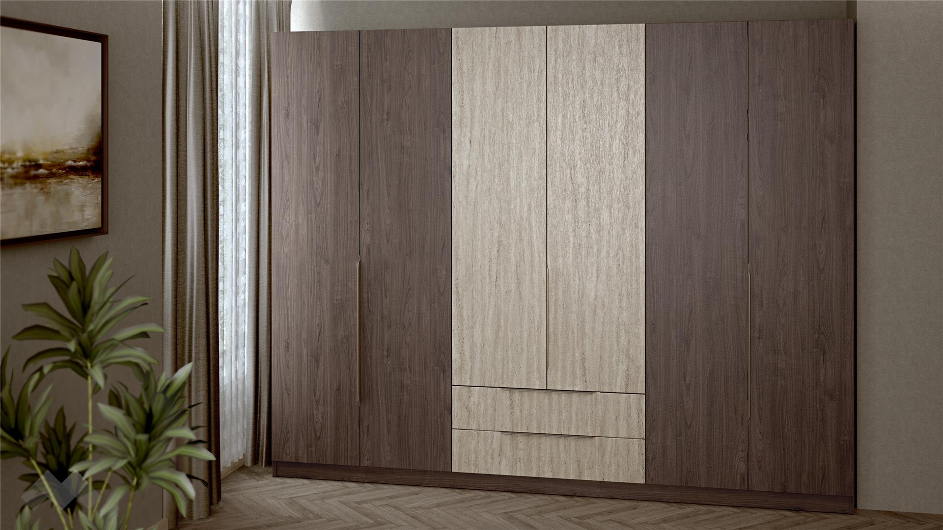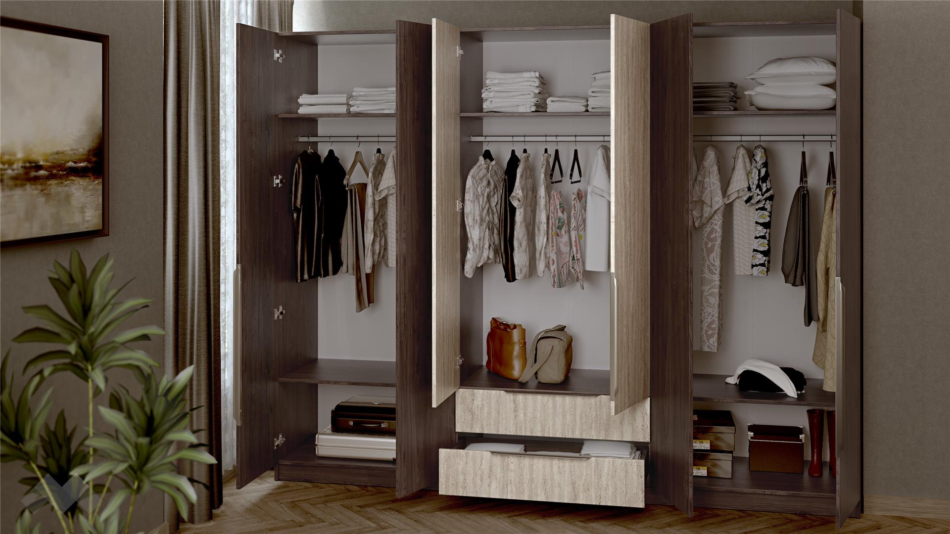 Зад крайните двойки врати, гардеробът ти предоставя по два рафта, на които да подредиш своите дрехи, кутии с обувки или спално бельо, а дълбочината му и по един лост за закачалки за връхни дрехи, или тези, които не искаш да бъдат измачкани. Зад средната двойка врати също има рафт и лост за закачалки, но в допълнение на функционалността ще откриеш две чекмеджета, в които както бельо или дрехи, може да прибереш малки електроуреди.