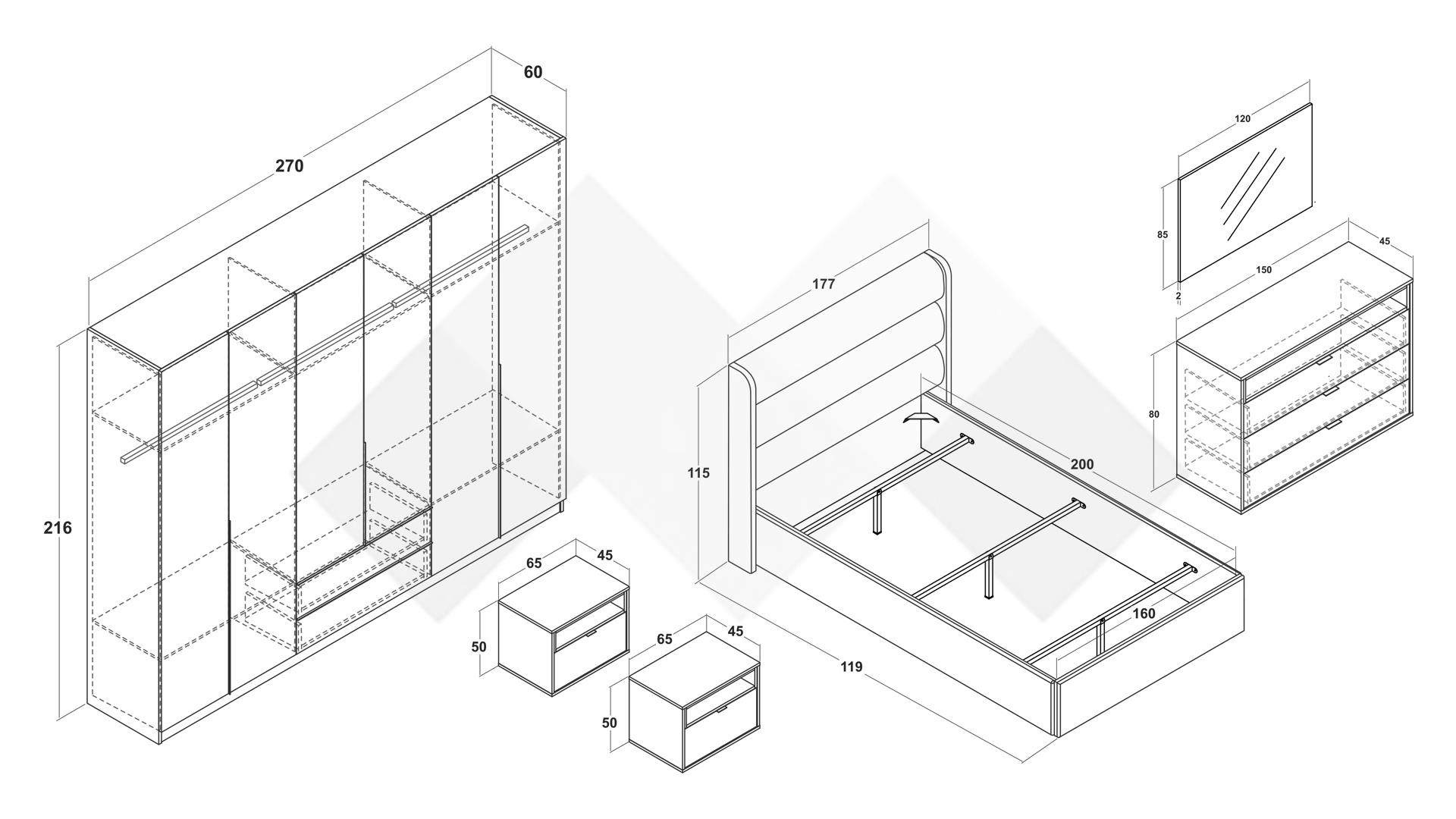 ✓ 18 мм ПДЧ ✓ шесткрилен гардероб ✓ 5 рафта ✓ 3 лоста за закачалки ✓ 2 чекмеджета ✓ тапицирана спалня ✓ за матрак 160/200 ✓ нощен шкаф ✓ отворен рафт ✓ чекмедже ✓ скрин с 3 чекмеджета ✓ огледало ✓ плавно затваряне на врати и чекмеджета ✓ модерен декор ✓ практично разпределение ✓ качествена изработка