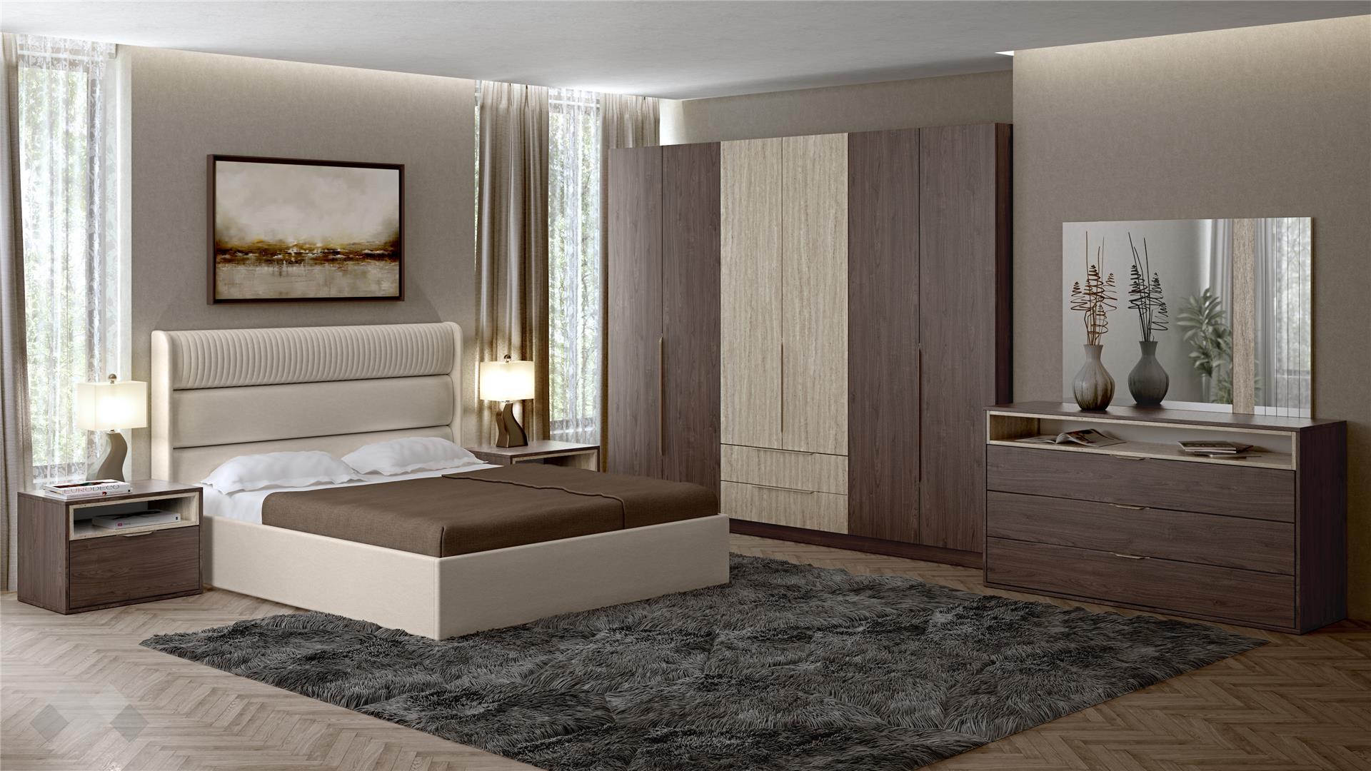 Спален комплект Барса впечатлява с балансирано съчетание на топлите дървесни нюанси на дъб арканзас и мекия, неутрален травертин, които създават уютна и спокойна атмосфера. Дизайнът е модерен и изчистен, с внимание към детайла и функционалността, което го прави отличен избор за съвременния дом.