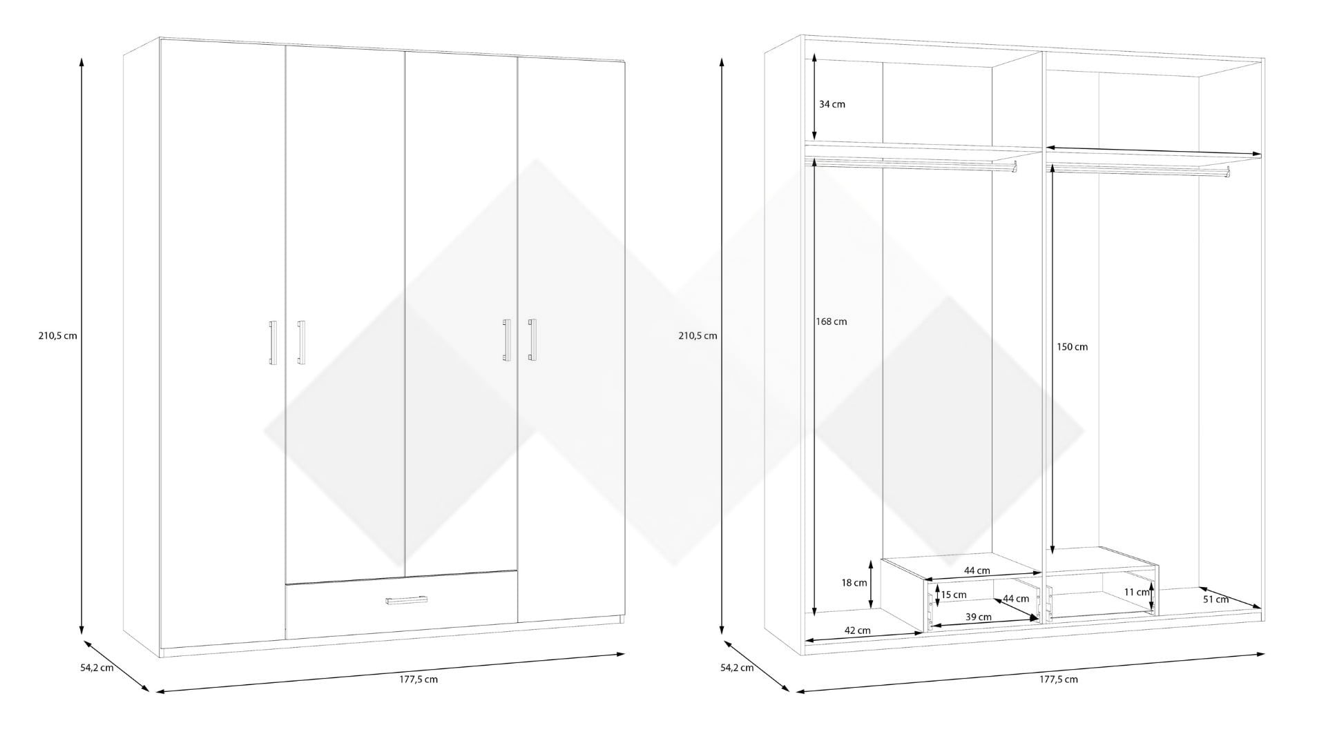 На твое разположение са два лоста за закачалки, където можеш да съхраняваш ризи, сака или палта. Гардеробът е с два рафта, на които можеш да организираш сгънати дрехи, хавлии, завивки или аксесоари. За още по-голямо удобство сме добавили и просторно чекмедже, подходящо за съхранение на бельо, чорапи или дребни принадлежности.