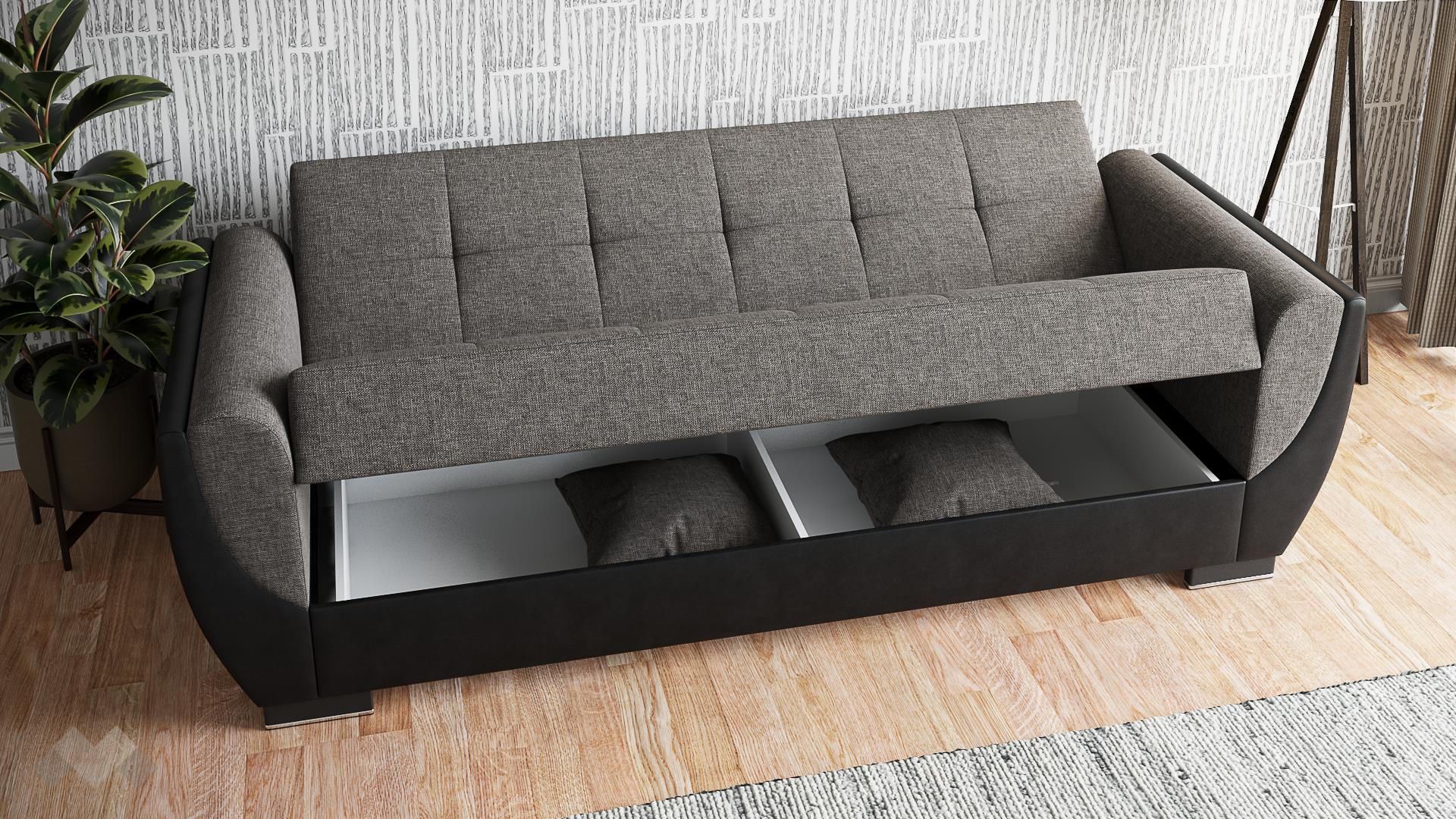 Конструкцията е от бонел пружина, която гарантира оптимална опора и устойчивост във времето. Диванът разполага и с ракла за съхранение – идеално място за спално бельо, завивки или други вещи, които искаш да държиш под ръка, но скрити от погледа.