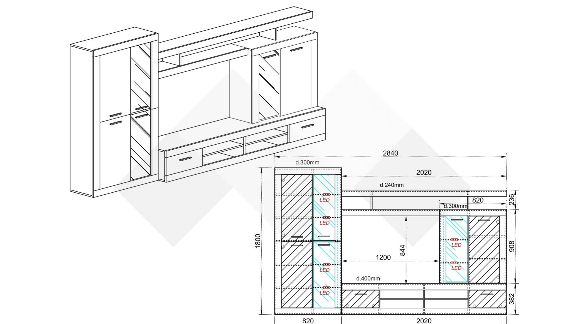 ТВ шкафът разполага с четири отворени ниши и два шкафа с падащи вратички. Там ще откриеш достатъчно място за цялата си съпътстваща техника като ТВ приемници, DVD плейъри, конзоли и други. Над него ще видиш затворен шкаф с два рафта и витрина, където можеш да подредиш любимите си сувенири или сервизите, които използваш най-често. Високият шкаф се състои от два затворени шкафа и две витрини.