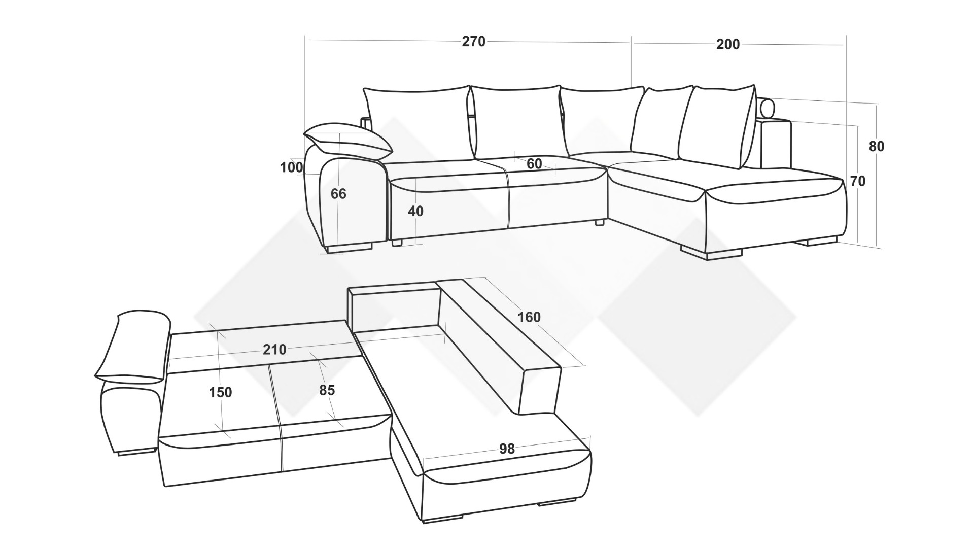 Д: 270 см Ш: 200 см В: 80 см
