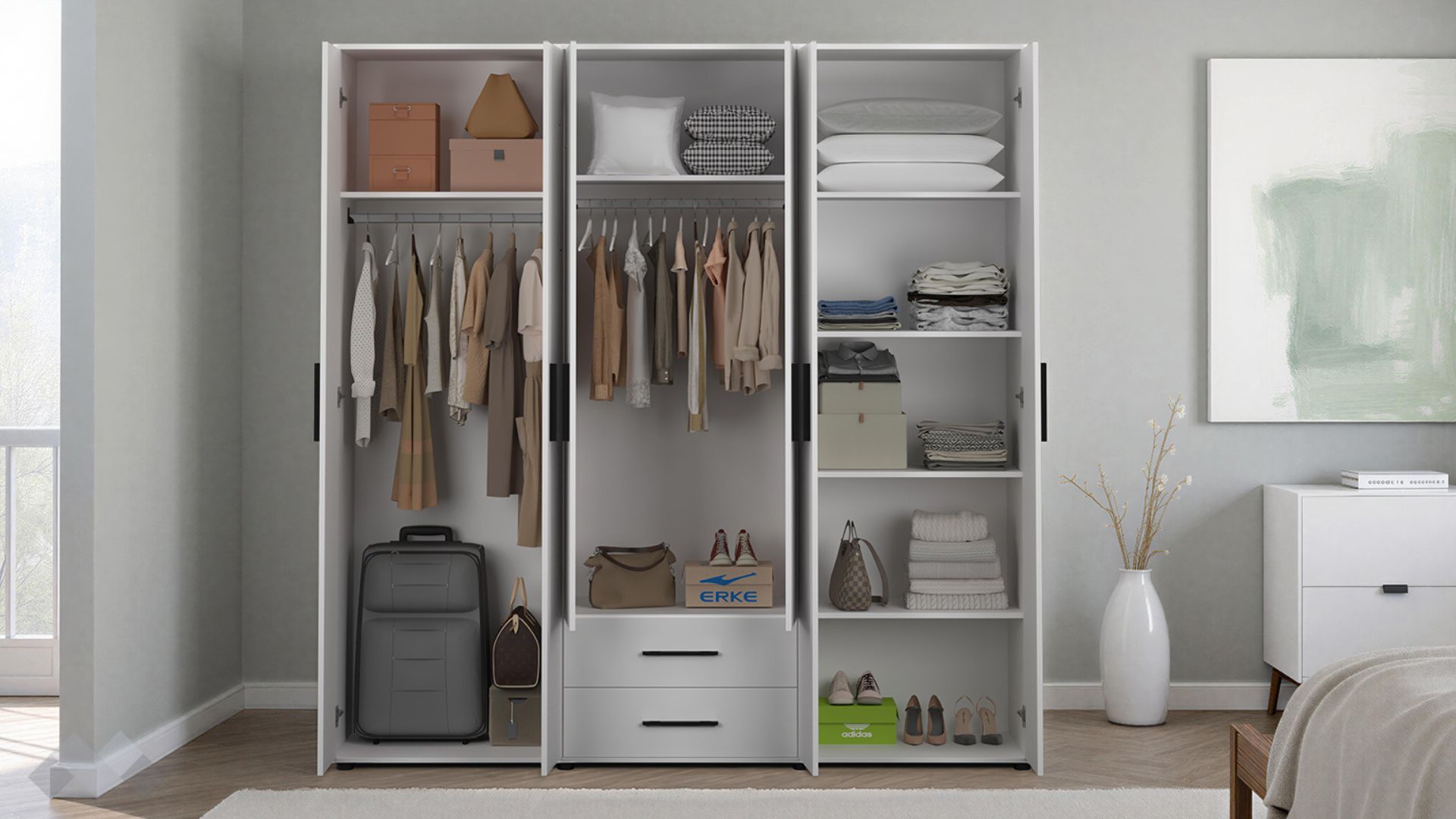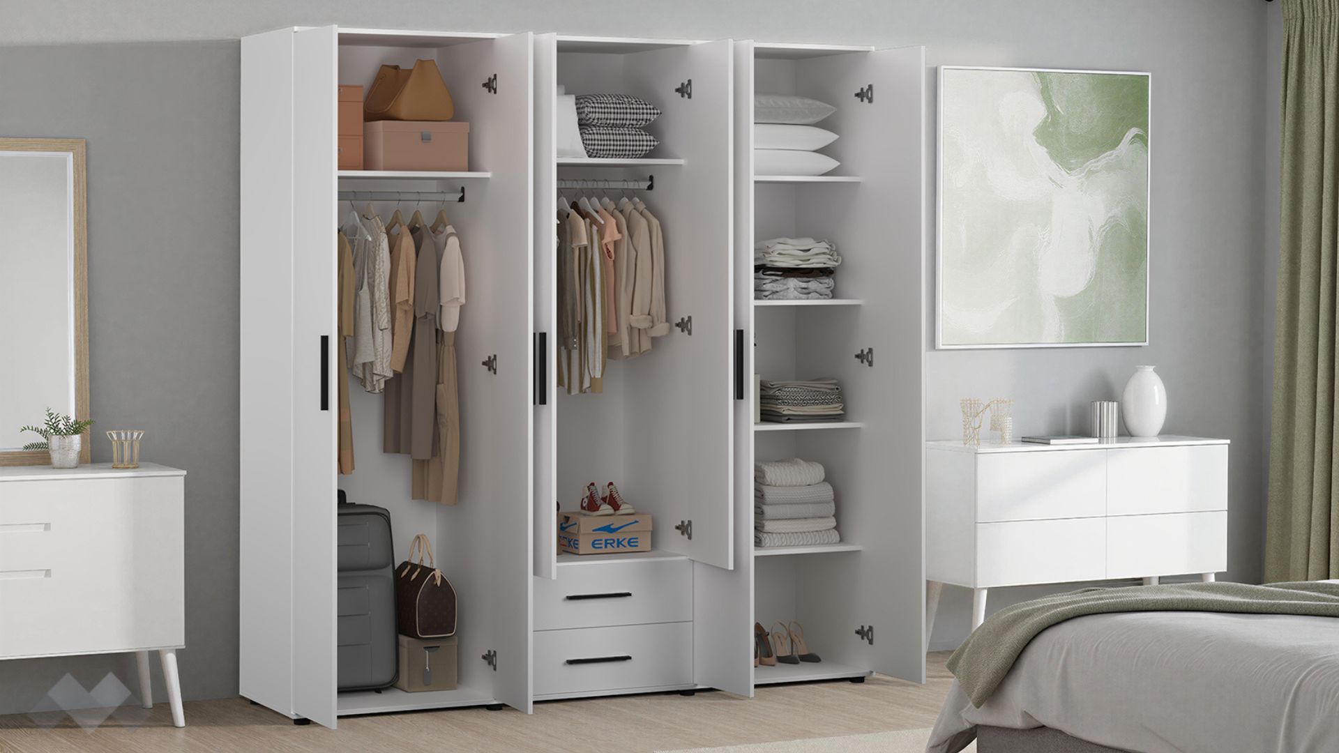 Гардеробът разполага с общо шест рафта, два лоста за закачалки и две чекмеджета. Шестте просторни рафта са идеални за подреждане на чанти, обувки, кутии или сгънати дрехи, а двата лоста за закачалки ти позволяват да съхраняваш сака, ризи и рокли в перфектен вид - без излишни гънки и намачкване. В двете чекмеджета можеш да подредиш бельо, чорапи, аксесоари, бижута или други малки вещи, които искаш да поддържаш подредени и лесно достъпни.