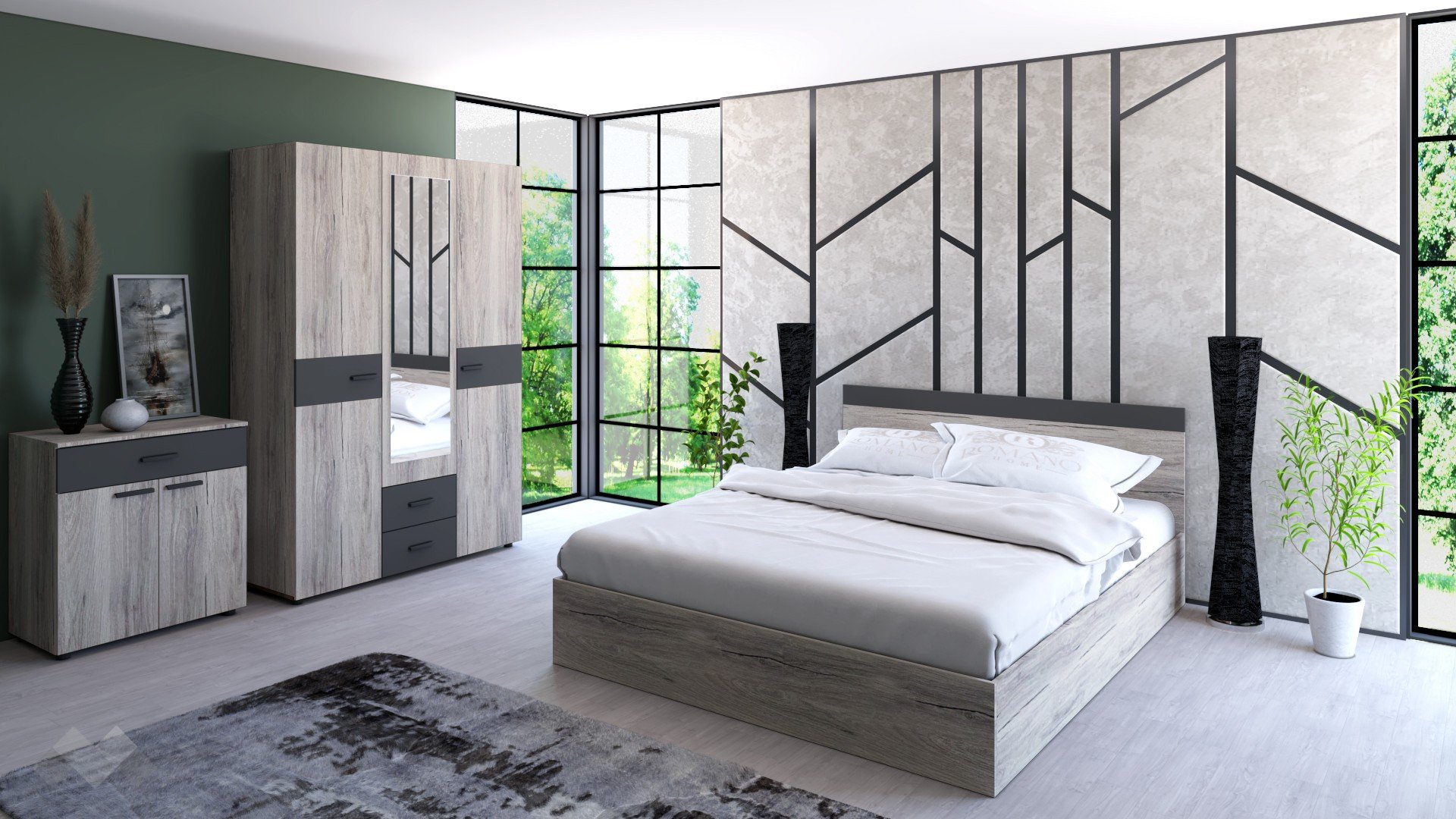 Спален комплект Дани D2 ще внесе усещане за стил и уют и ще направи спалнята ти мечтано кътче. Разполага с всичко, от което се нуждаеш – спалня, гардероб с отлично разпределение и скрин с чекмедже и шкафче с две вратички.
