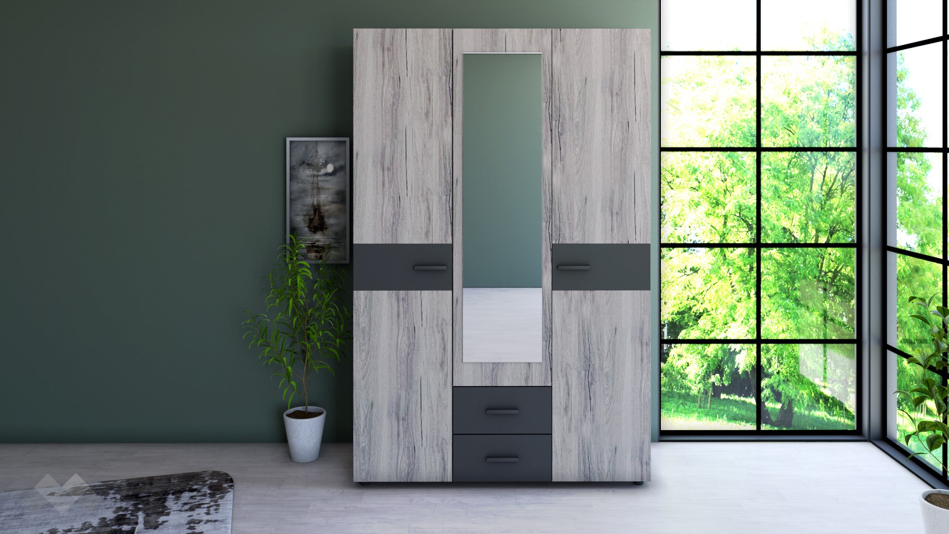 Разпределението на гардероба е отлично – предлага ти крило с 3 рафта за дрехите, които съхраняваш сгънати, лост за закачалки и две чекмеджета подходящи за бельо или аксесоарите ти.