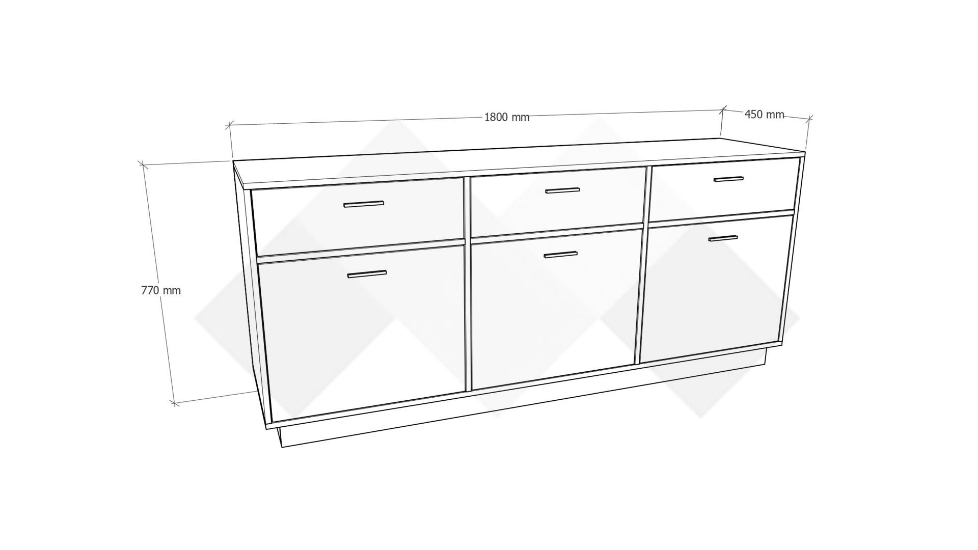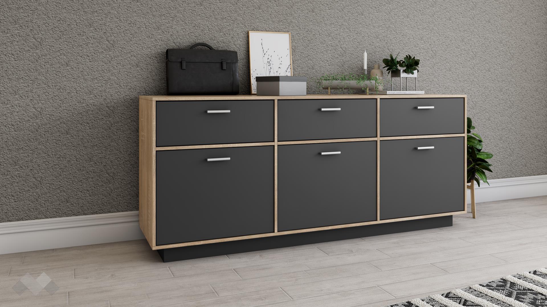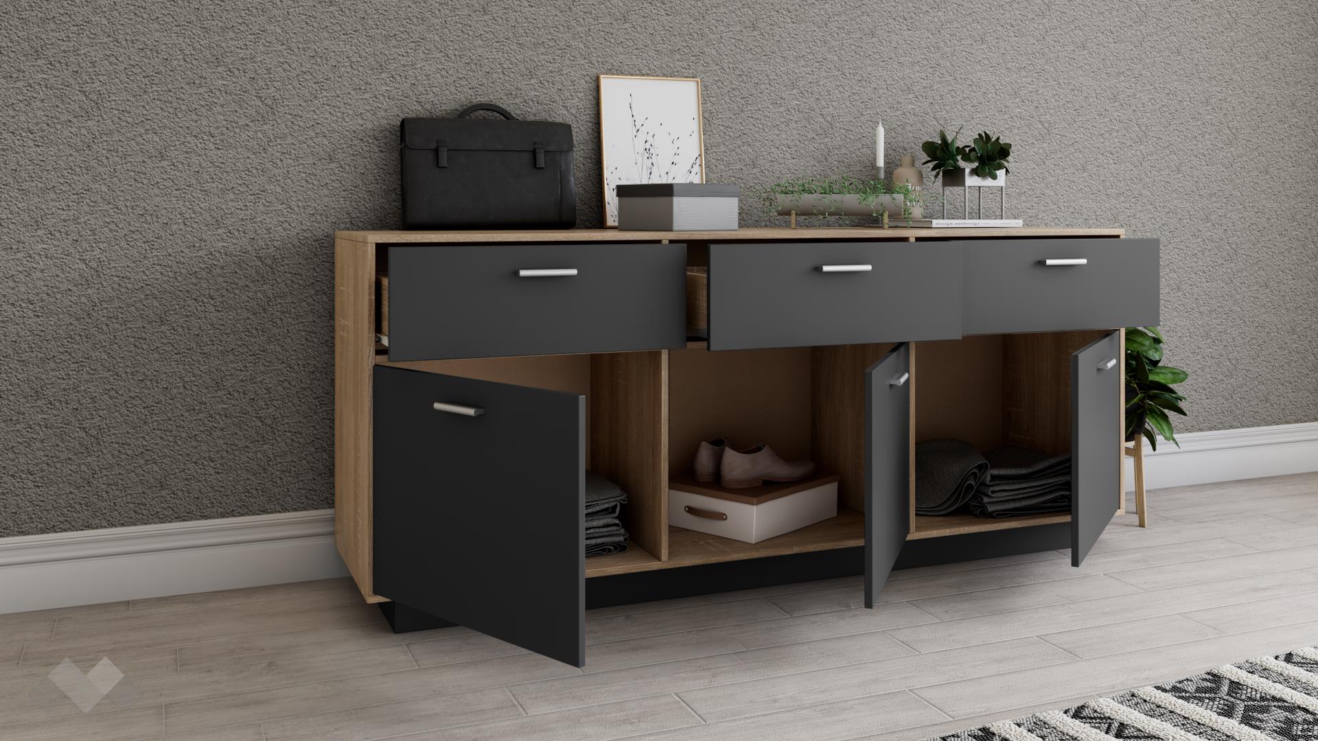 На твое разположение са три чекмеджета и три шкафа. Моделът е универсален и ще намери приложение във всяка стая. Можеш да го поставиш в спалнята, където да ти предостави допълнително място за дрехи и бельо, а върху горния плот може да подредиш козметика, аксесоари или ефектна декорация. Скринът може да бъде и чудесно допълнение към всекидневната, където да ти послужи за организиране на всички вещи, за които не намираш място в секцията. Ако имаш нужда от допълнително място за обувки и аксесоари, можеш да го поставиш и в антрето.