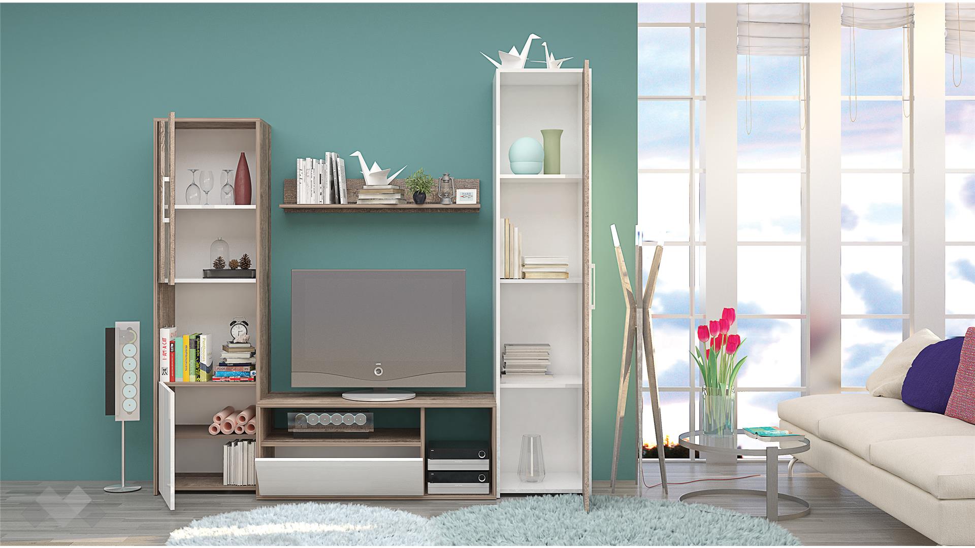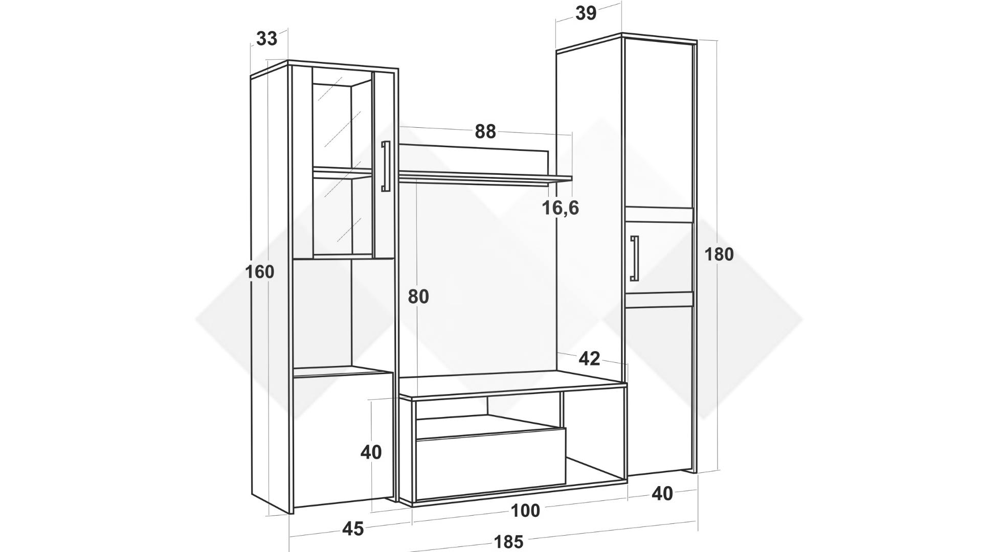 Основата на секцията представлява ТВ шкаф с две отворени ниши и шкаф с падаща врата, където ще откриеш достатъчно място за декодери, конзоли и друга съпътстваща техника. Високият шкаф се състои от отворена ниша и два затворени шкафа с по един рафт. Единият затворен шкаф е с остъклена врата, за да може да го ползваш като витрина. Зад вратите на еднокрилния гардероб ще видиш три рафта, готови да поберат всички вещи, които искаш да останат скрити. Към секцията сме добавили и практична етажерка, подходяща за подреждане на книги, скъпи спомени като фотографии или сувенири, а можеш и да аранжираш със стилни декорации и украси – изборът е твой!