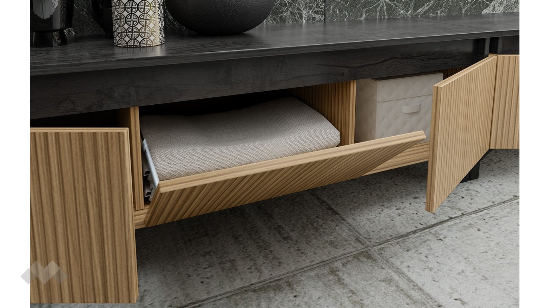 Разполага с два затворени шкафа с врати, които са със странично отваряне и с един затворен шкаф с падаща врата. С трите си просторни затворени шкафа осигурява достатъчно място за съхранение на всичко необходимо – от медийни устройства и дистанционни до книги и аксесоари.