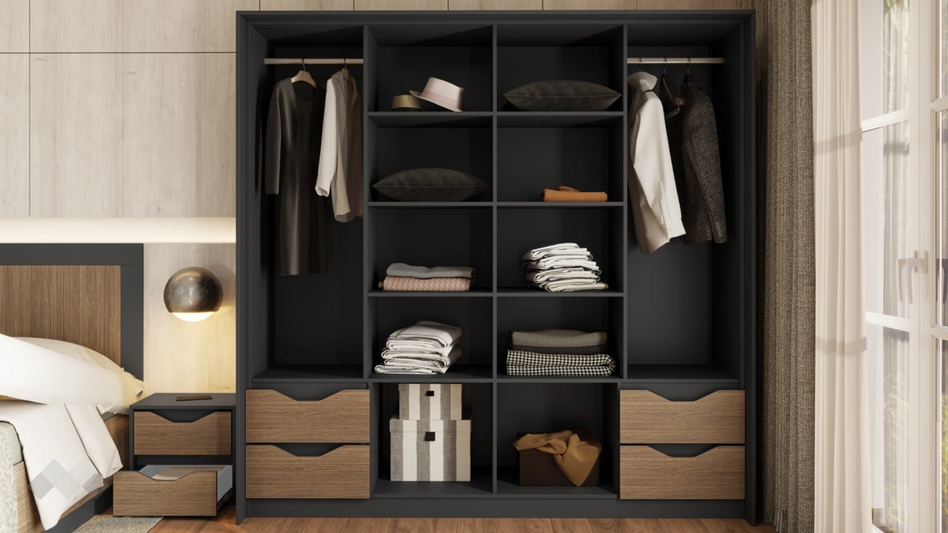 Четирикрилният гардероб ти дава свободата да подредиш дрехите и аксесоарите си така, както обичаш. С помощта на рафтовете и двата лоста за закачалки всяка дреха ще си има своето място. Гардеробът разполага и с четири чекмеджета, в които лесно да организираш бельо или други аксесоари.
