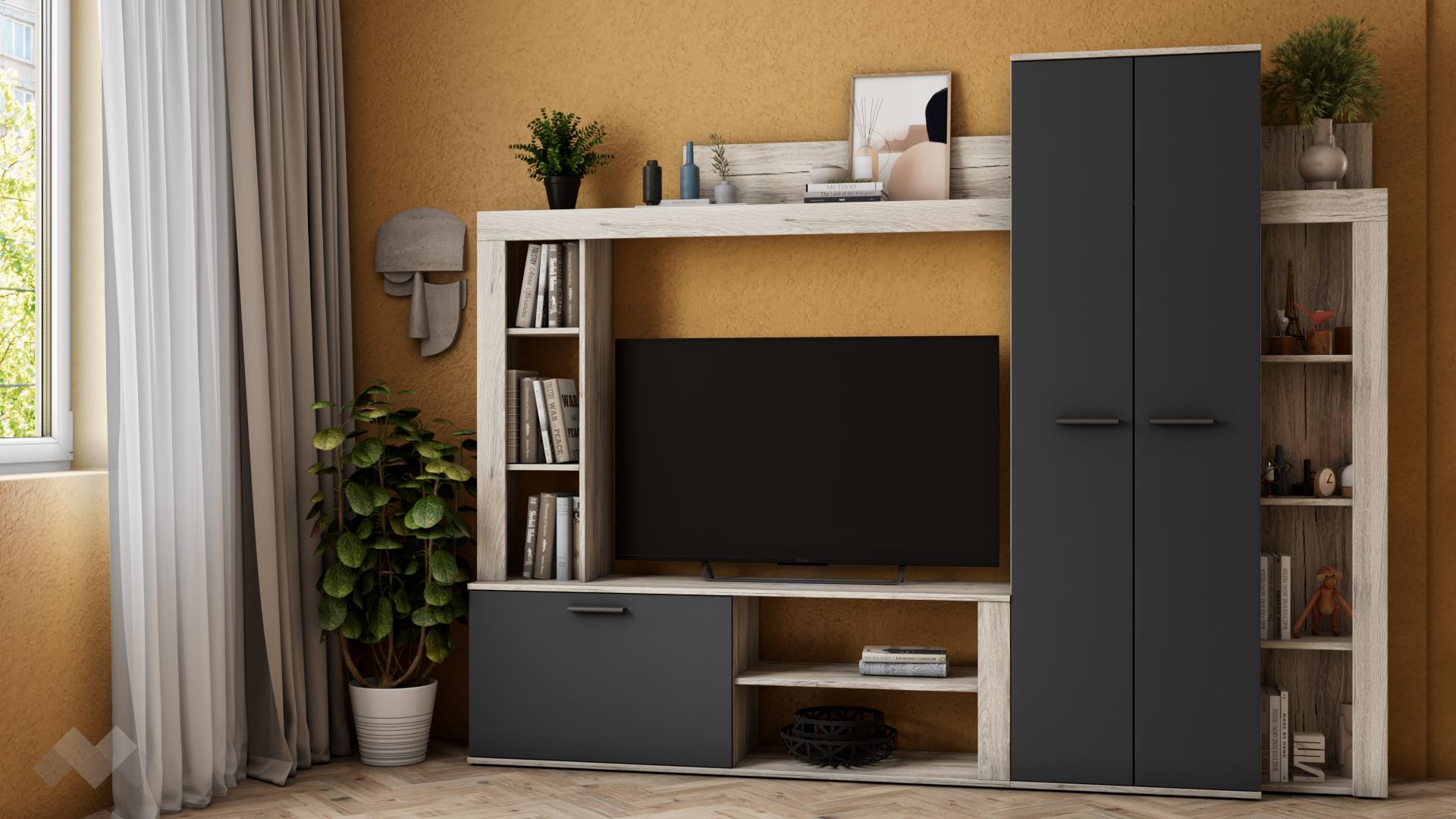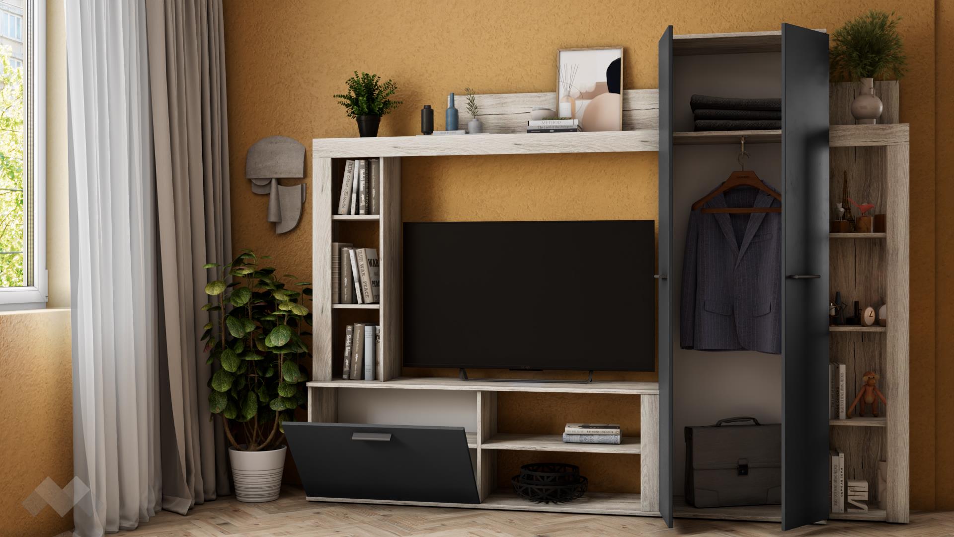 Секция Ести разполага с двукрилен гардероб с лост за закачалки и 2 рафта, на които можеш да съхраниш част от своите дрехи, рафт с място за ТВ, затворен шкаф, отворени рафтове и етажерка. В затворения шкаф разполагаш с достатъчно пространство за вещите, които искаш да не са на показ, а на отворените рафтове можеш да подредиш красива декорация, любимата си книга или вещите, които ще придадат допълнителен уют в хола ти.