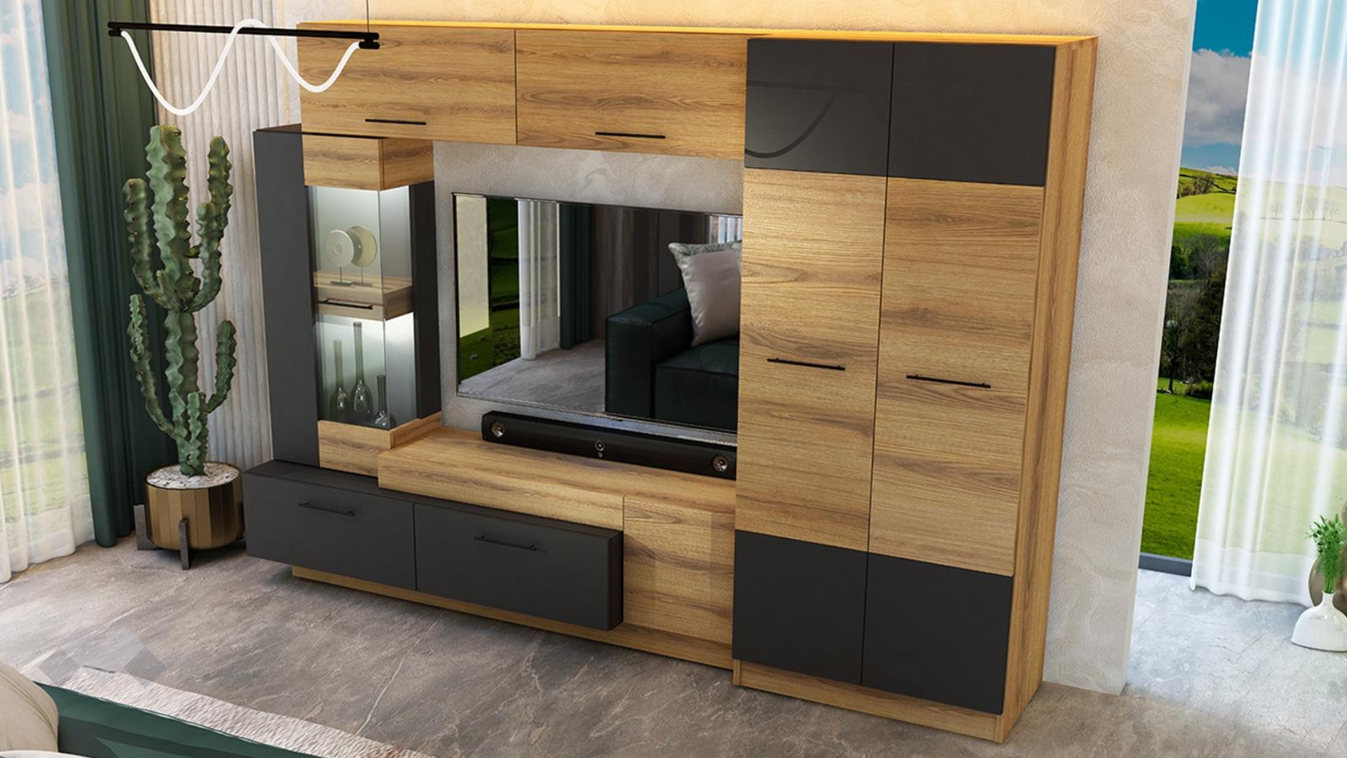 Тази стилна модулна секция съчетава съвременен дизайн и изключителна функционалност – перфектният акцент за всяка модерна дневна. Изработена в топъл дървесен декор с елегантни матови антрацитни елементи, тя създава усещане за уют, ред и баланс.