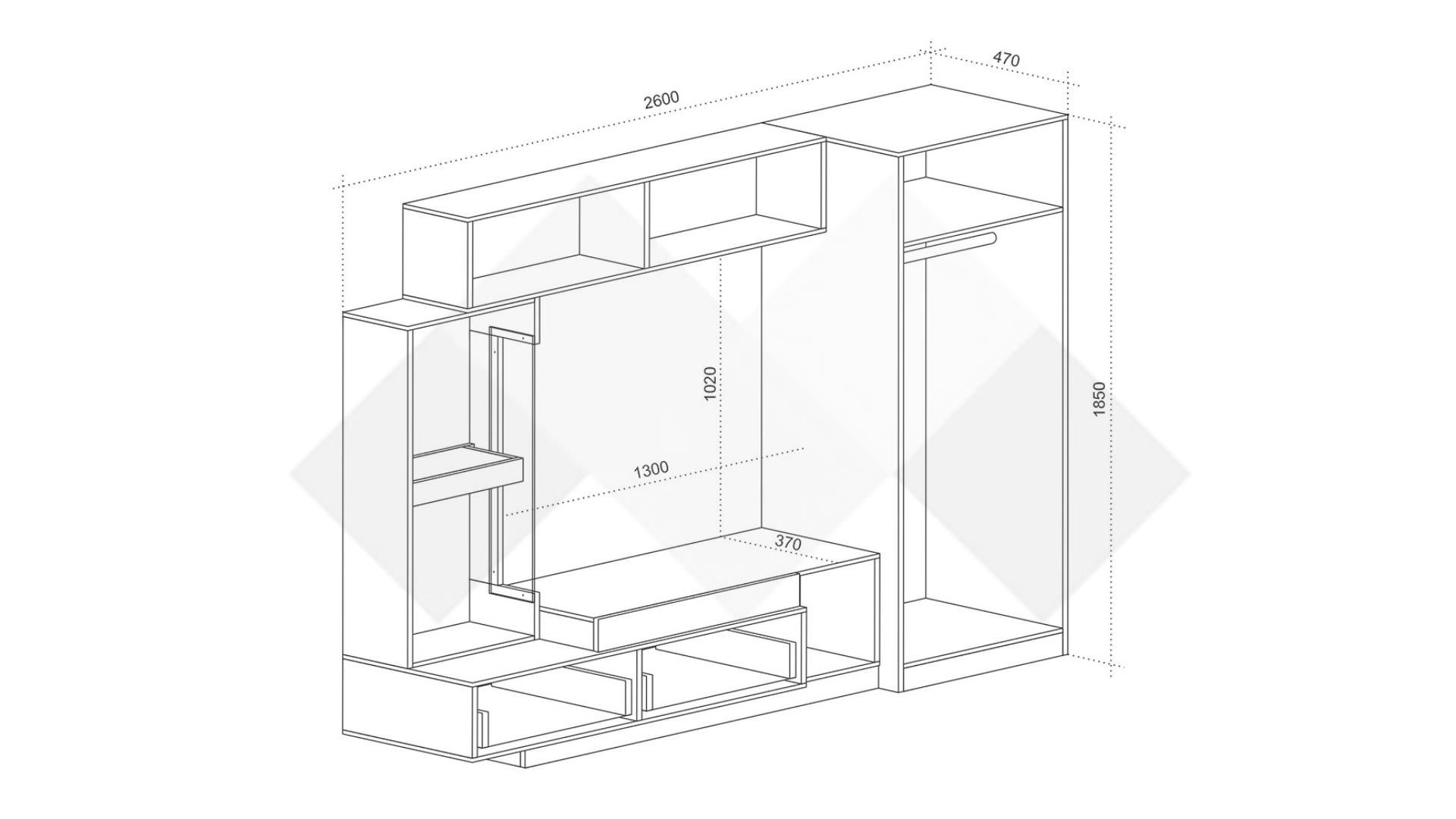 Централната част на секцията е просторен ТВ шкаф с масто за телевизор с размери 130/102. Под него се намират две широки чекмеджета, а над него има два шкафа идеални за съхранение на техника, аксесоари и други вещи.