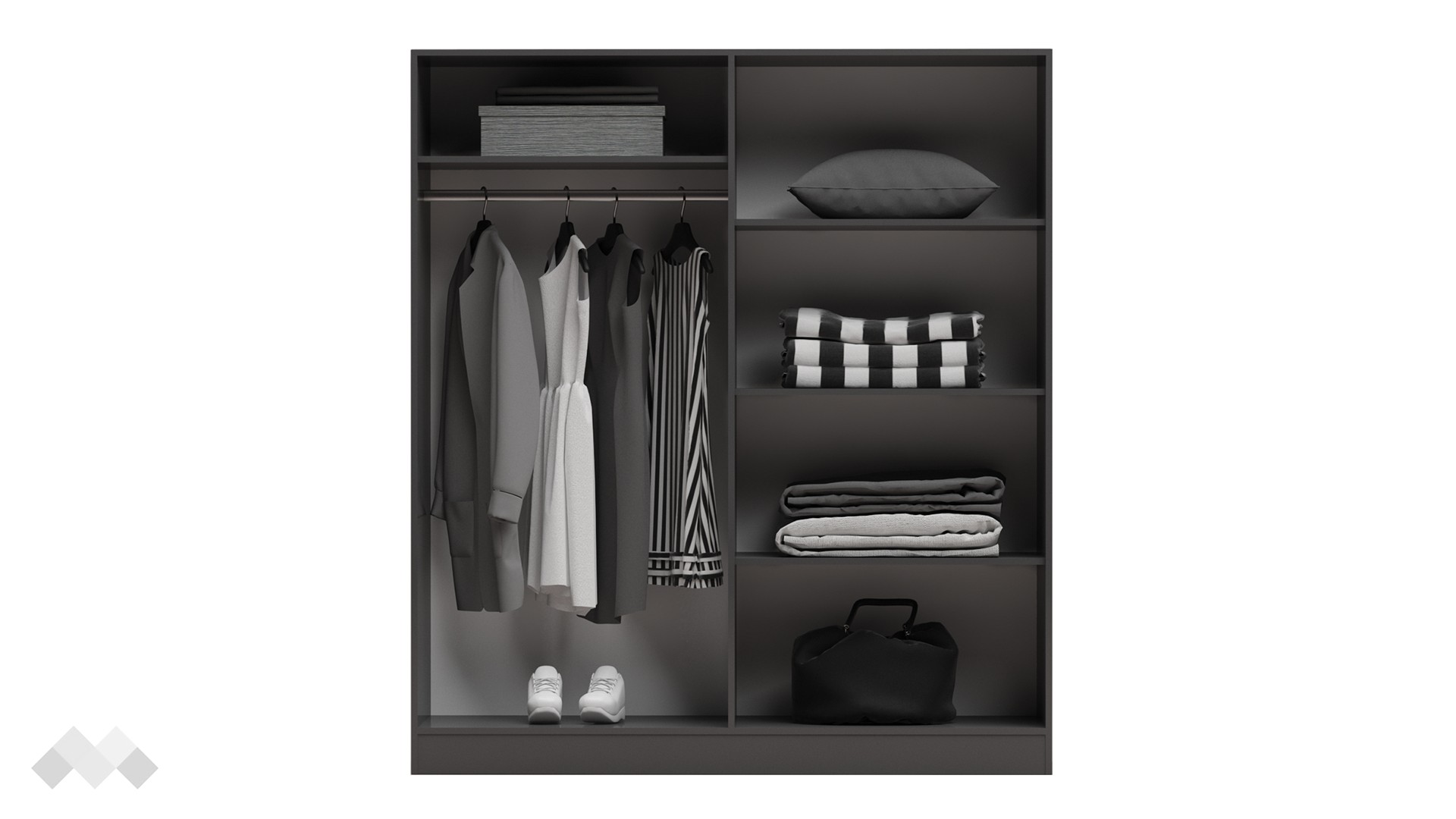Зад двете крила от дясната страна се крият три рафта, където можеш да подредиш дрехите, които съхраняваш сгънати – тениски, пуловери, дънки и други. От лявата страна на гардероба ще видиш още един рафт и лост за закачалки. Можеш да използваш рафта за организиране на завивки, възглавници, аксесоари или други необходими за теб вещи. Лостът за закачалки е удобен за палта и по-обемни връхни дрехи, а пространството под тях е подходящо място за обувки и кутии за съхранение. За допълнително удобство вратите са снабдени с механизми за плавно затваряне.