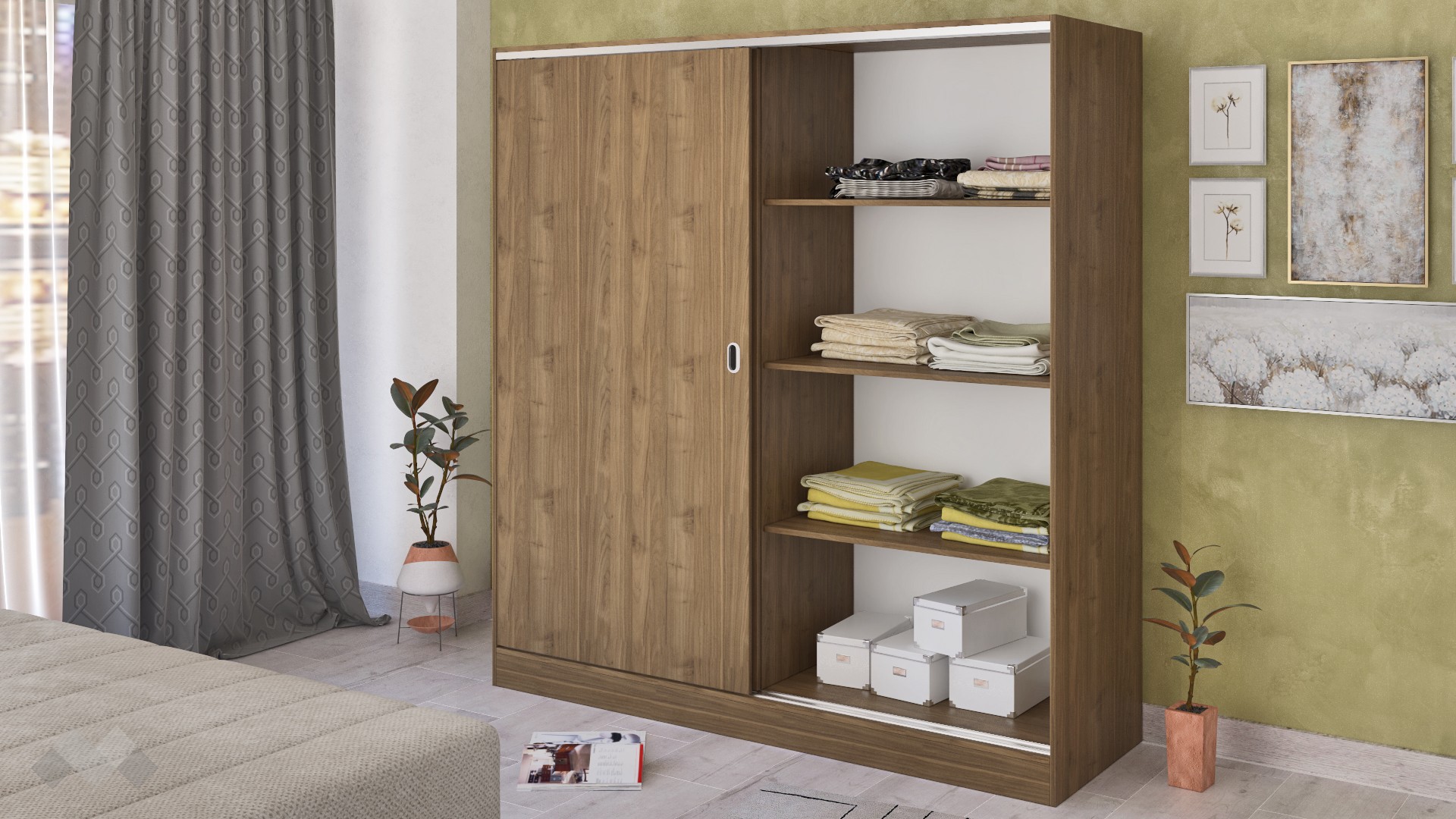 Гардероб Глендейл е перфектният избор за почитателите на практичните мебели със семпъл и изчистен дизайн. Той е двукрилен гардероб с плъзгащи врати и външен механизъм. Модерният плъзгащ механизъм прави отварянето на вратите леко и приятно, без да е необходимо допълнително пространство пред тях. Щом ги отвориш, вътре ще откриеш четири големи рафта с оптимална височина и просторно крило за закачалки.