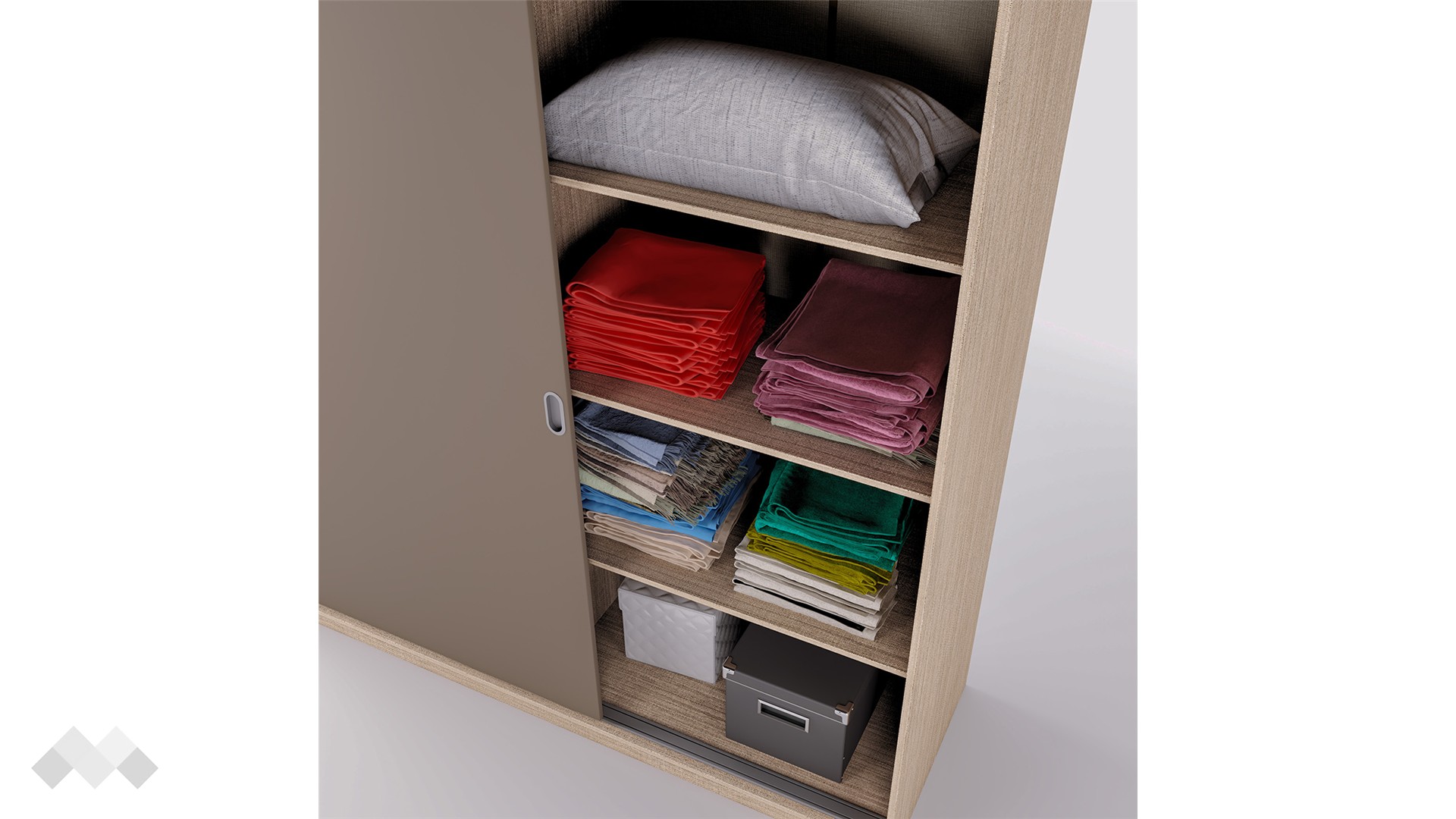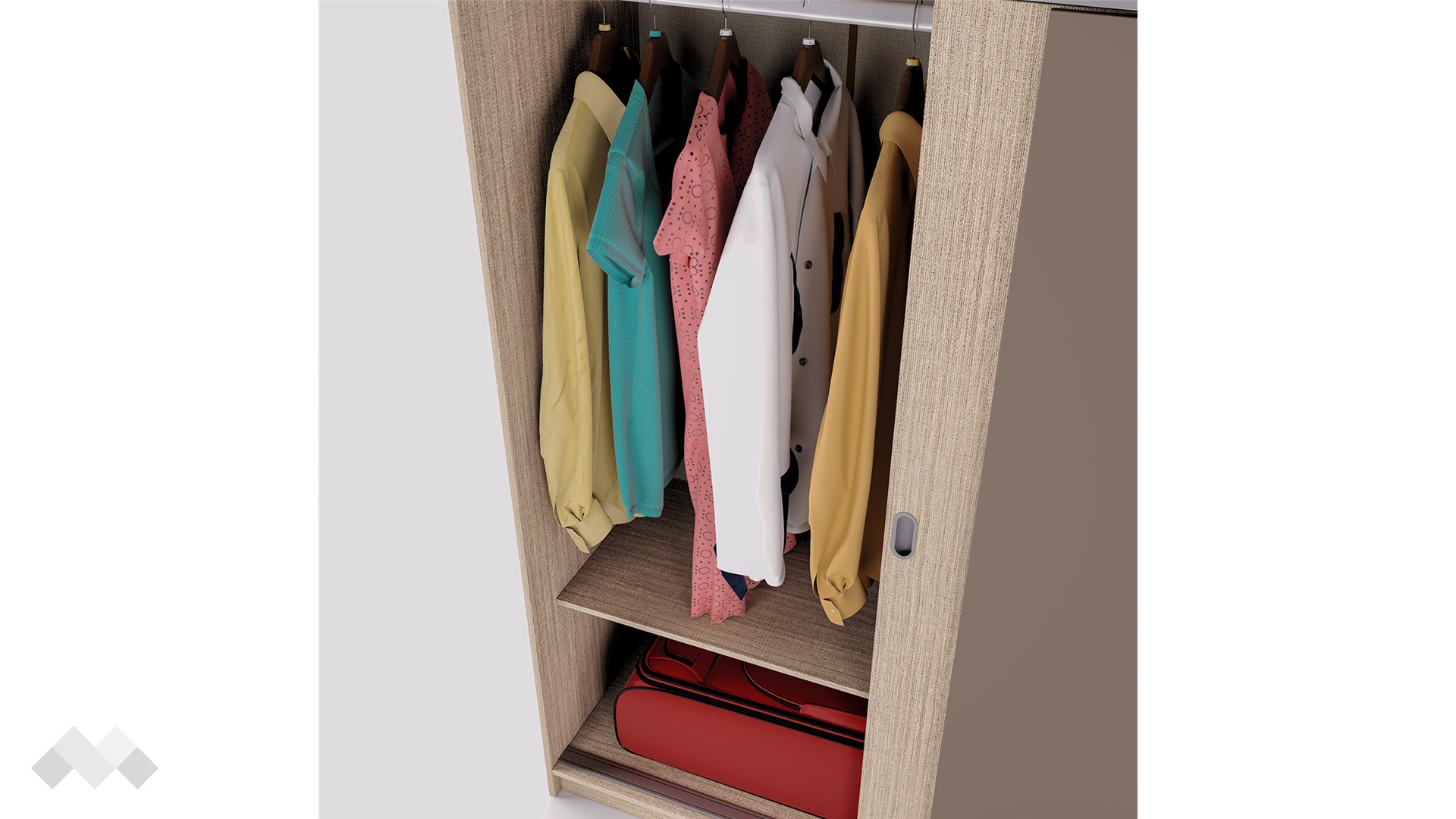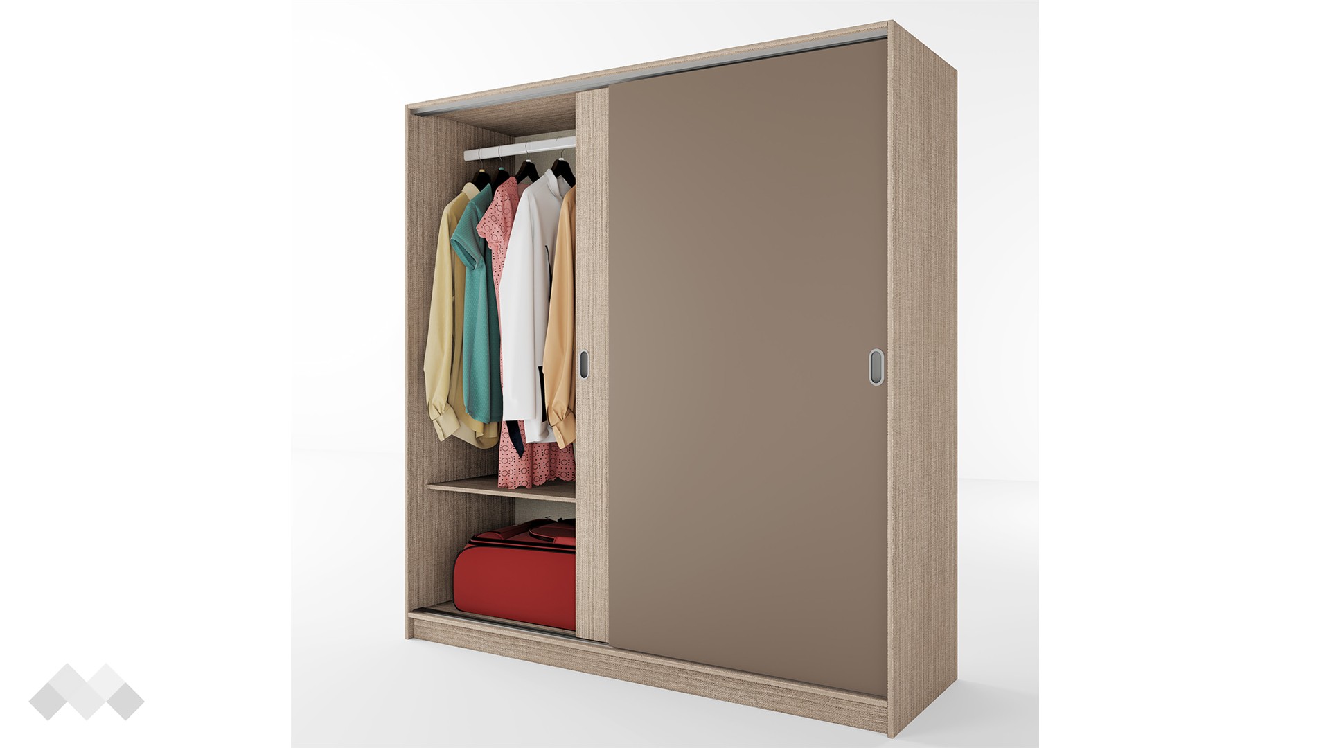 Гардероб Глендейл е перфектният избор за почитателите на практичните мебели със семпъл и изчистен дизайн. Той е двукрилен гардероб с плъзгащи врати и външен механизъм. Модерният плъзгащ механизъм прави отварянето на вратите леко и приятно, без да е необходимо допълнително пространство пред тях. Щом ги отвориш, вътре ще откриеш четири големи рафта с оптимална височина и просторно крило за закачалки.