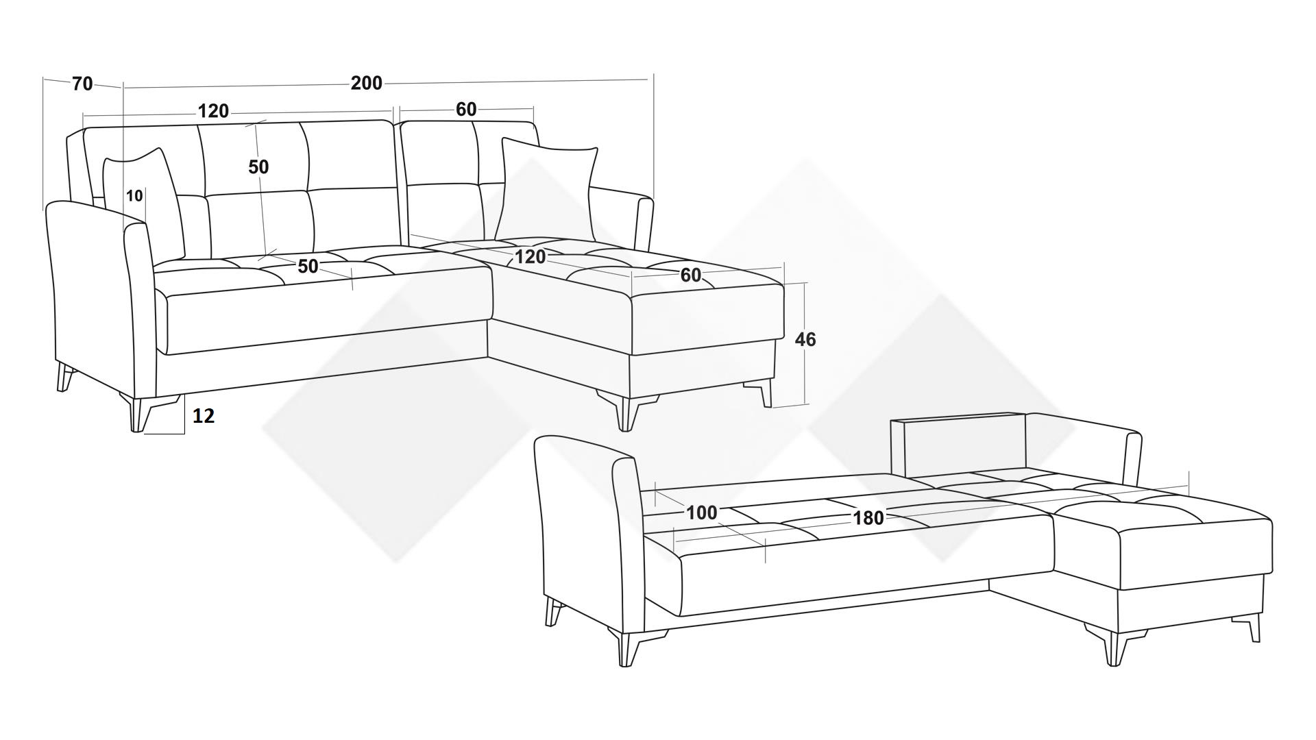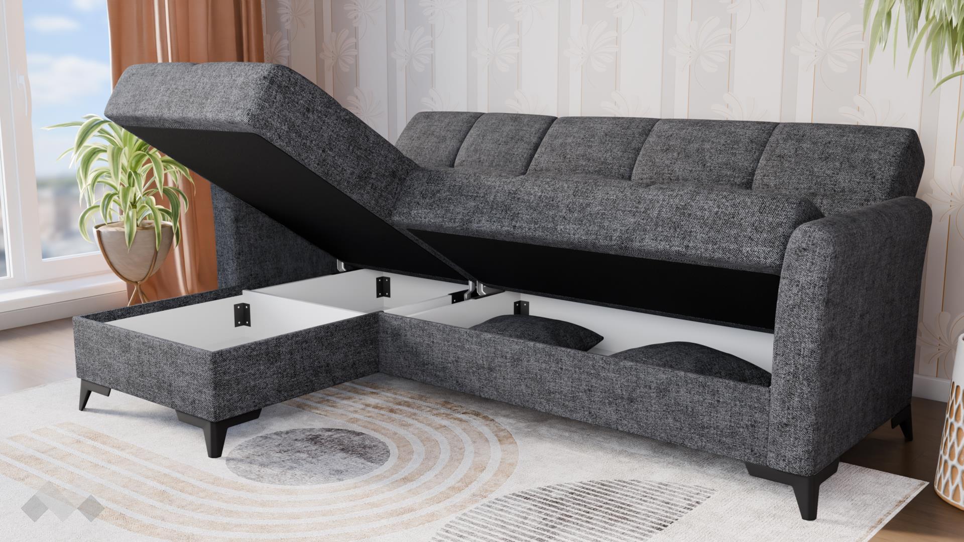 Диванът разполага с функция сън, която бързо и лесно превръща модела в удобно легло. Допълнително предимство е практичната ракра за съхранение, разположена под лежанката – идеална за одеяла, възглавници и спално бельо.