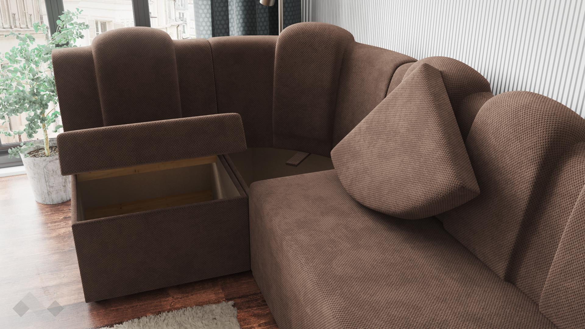 Височината на ъгъла и твърдостта му е съобразена с необходимата височина за седене при хранене. Позицията на гърба е по-изправена, отново съобразена с оптималната поза за хранене. За допълнително удобство поставихме 5 възглавници, вградени в гърба на дивана. Диванът разполага и с две ракли - под лежанката и в ъгловата част.