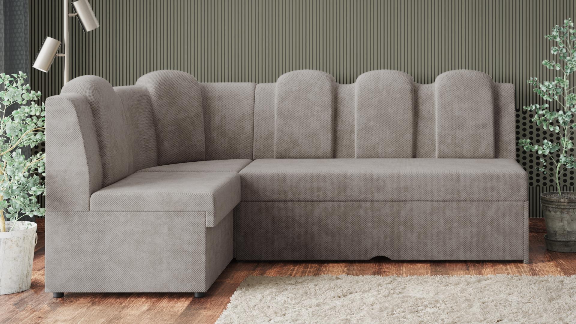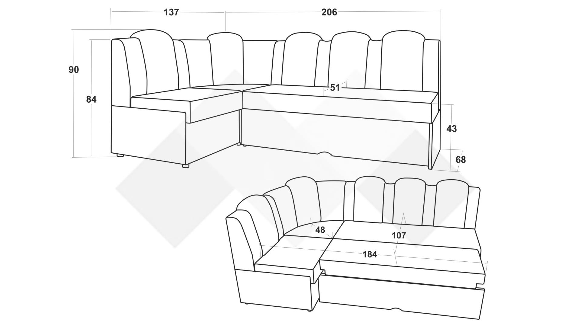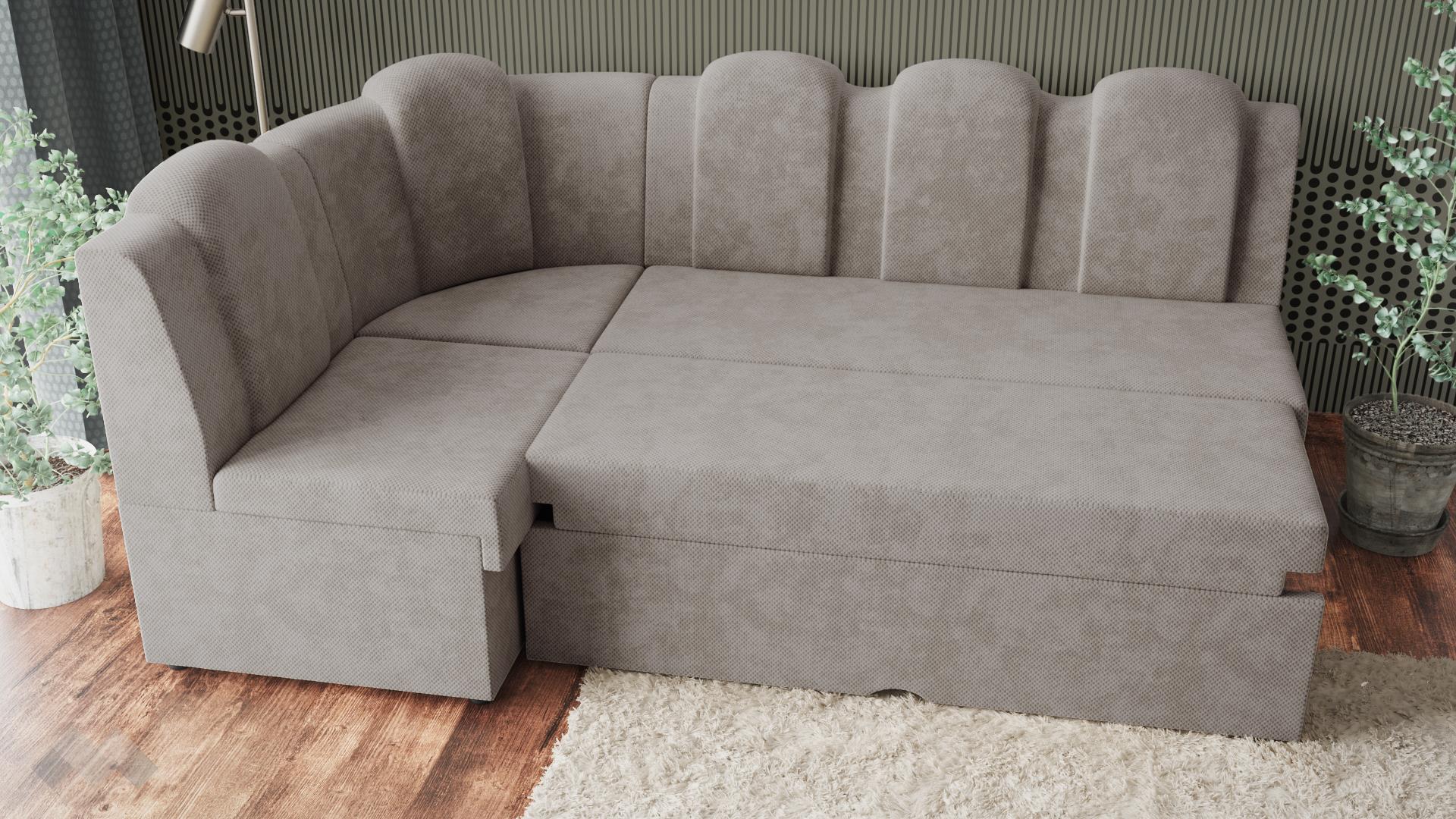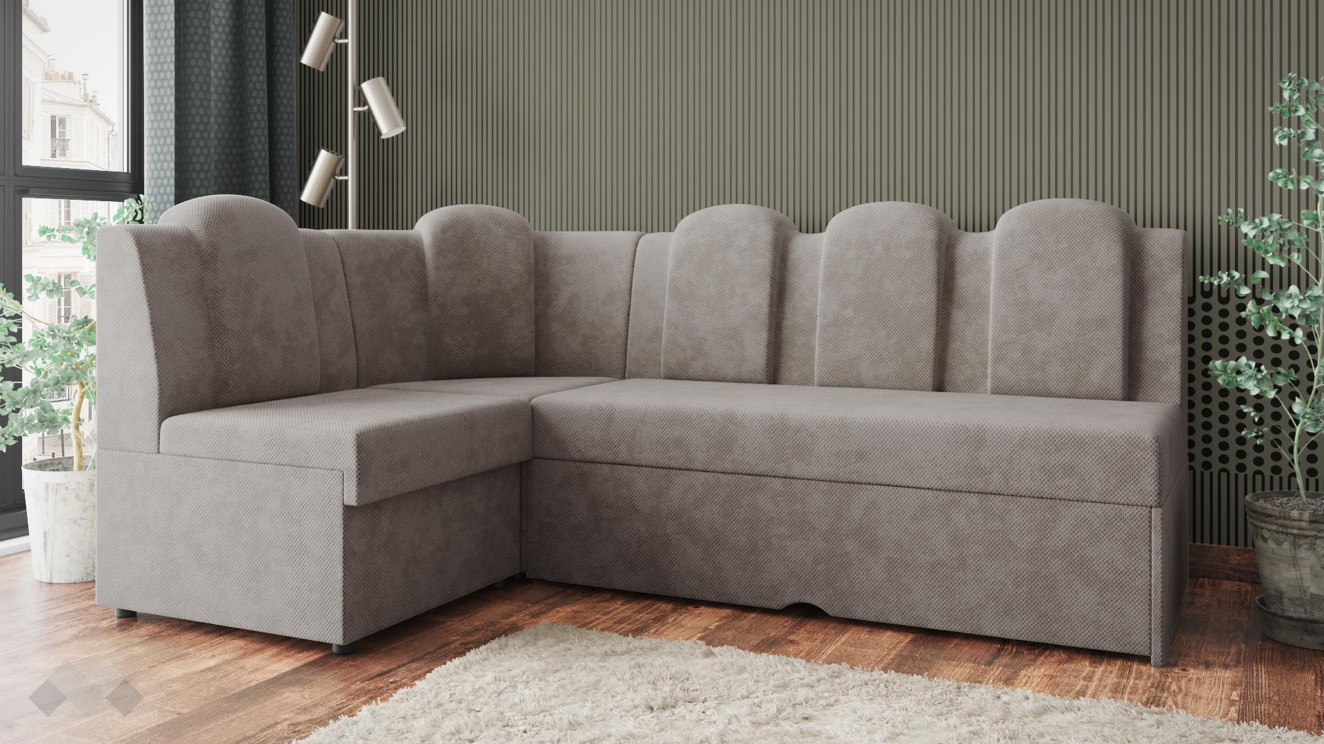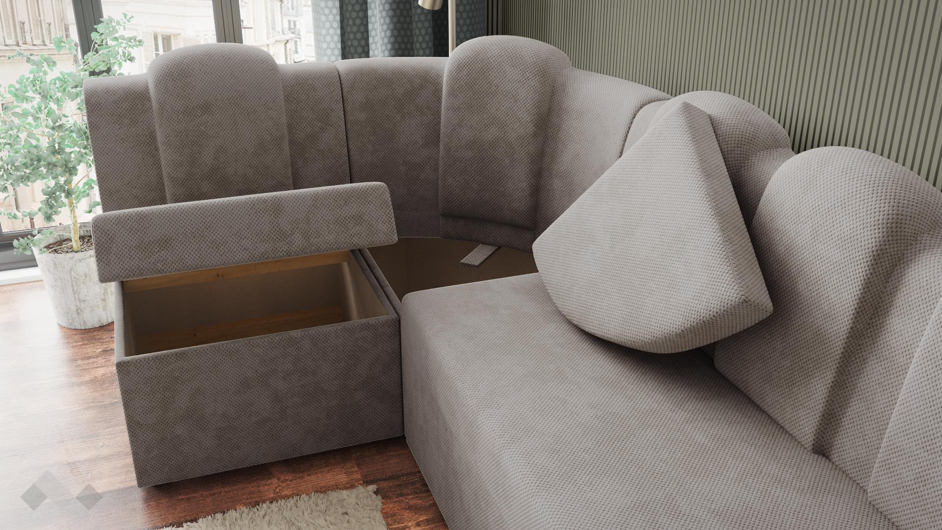 Височината на ъгъла и твърдостта му е съобразена с необходимата височина за седене при хранене. Позицията на гърба е по-изправена, отново съобразена с оптималната поза за хранене. За допълнително удобство поставихме 5 възглавници, вградени в гърба на дивана. Диванът разполага и с две ракли - под лежанката и в ъгловата част.