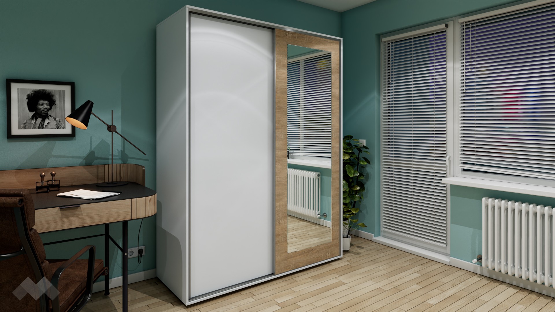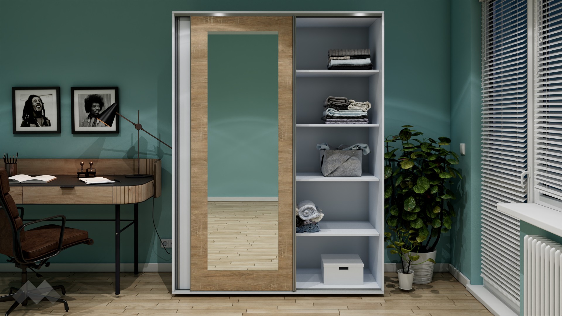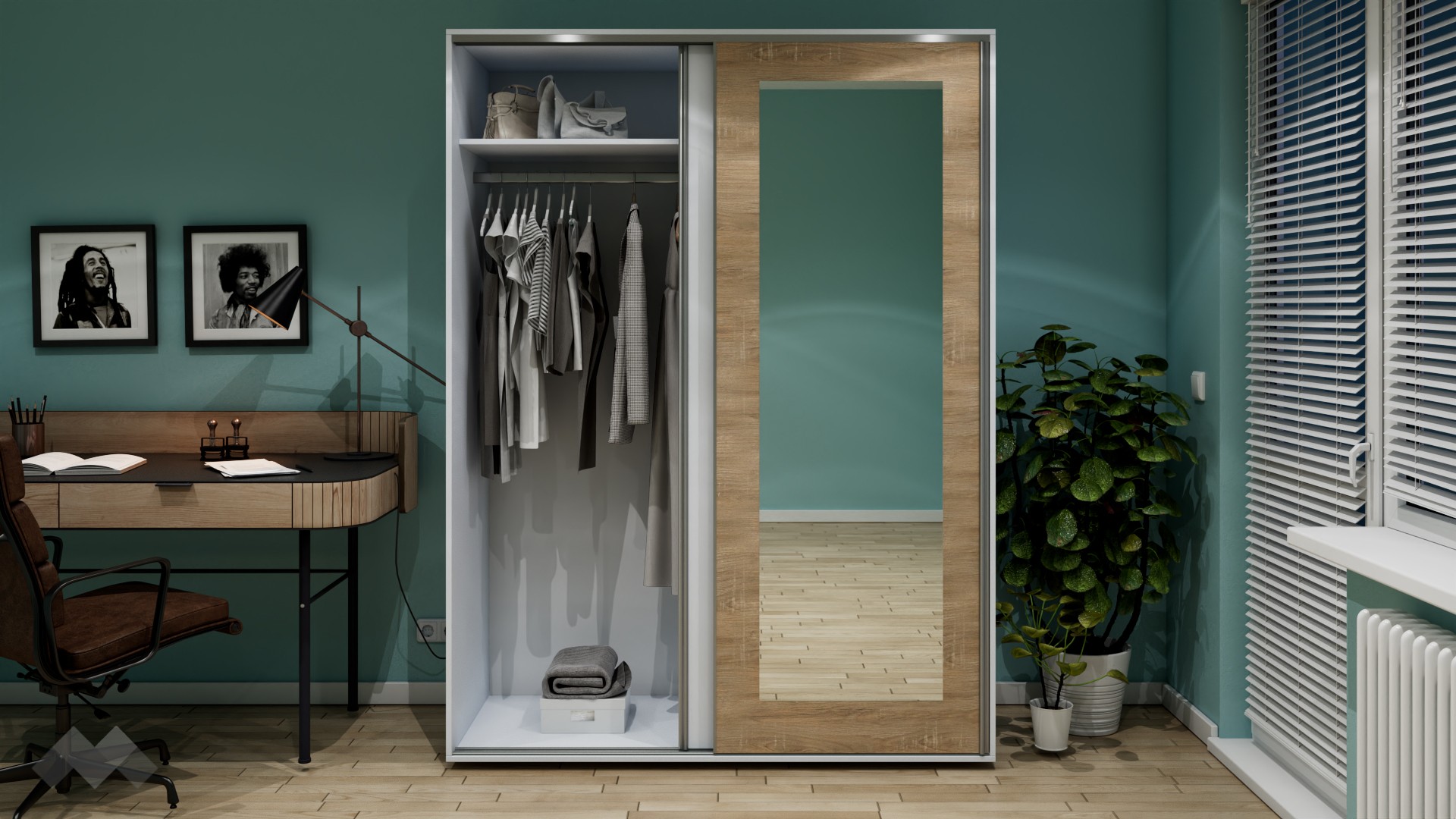 Той е с плъзгащи врати. Модерният плъзгащ механизъм прави отварянето на вратите лесно, без да се тревожиш, че трябва да осигуриш допълнително пространство пред самия гардероб. Това го прави особено подходящ и за по-малки спални помещения. Щом го отвориш, вътре се откриват четири големи рафта с оптимална височина и просторно крило за закачалки.