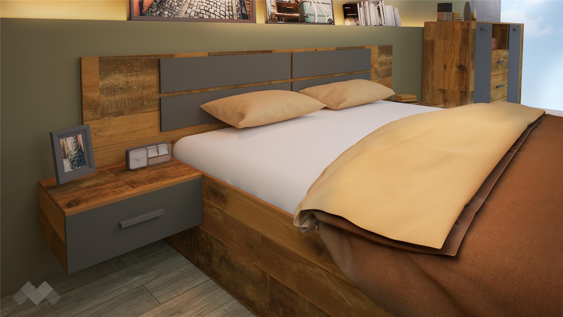 Спалнята е достатъчно голяма, за да ти предостави необходимото пространство и комфорт за сън. Таблата е ефектно декорирана с правоъгълни форми в цвят графит като акцент. Друг интересен акцент в дизайна са монтираните към спалнята нощни шкафчета, те естествено допълват нейната визия. Благодарение на свободностоящата ракла ще намериш допълнително място за одеяла и възглавници, за да са винаги под ръка, щом ти потрябват. Раклата се отваря посредством механизъм за повдигане на горния плот.