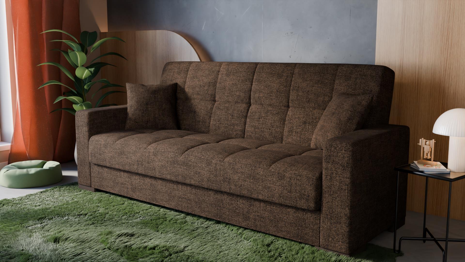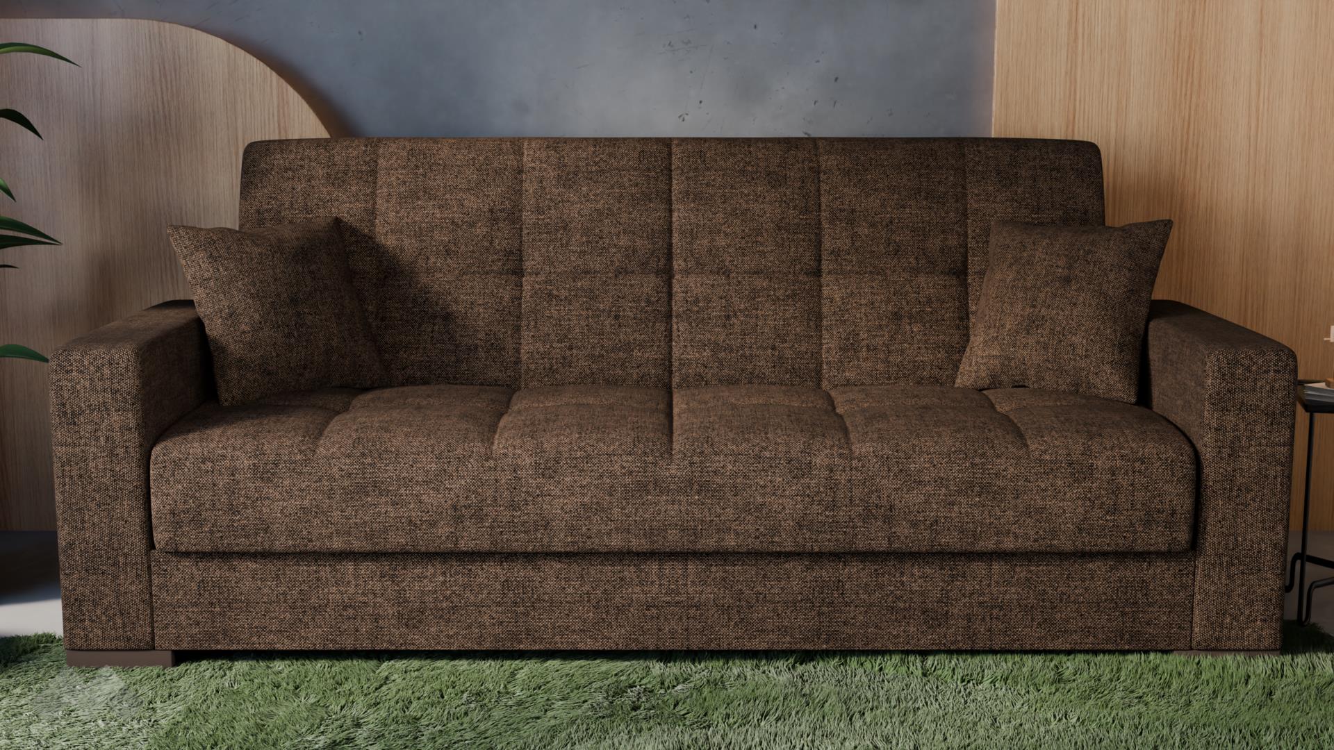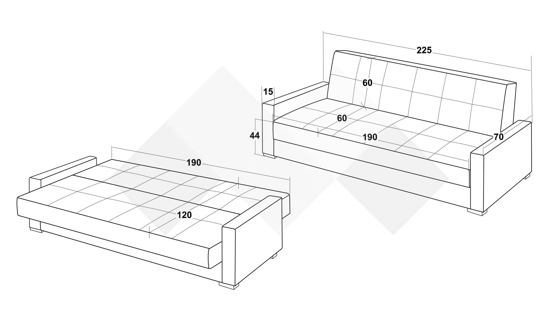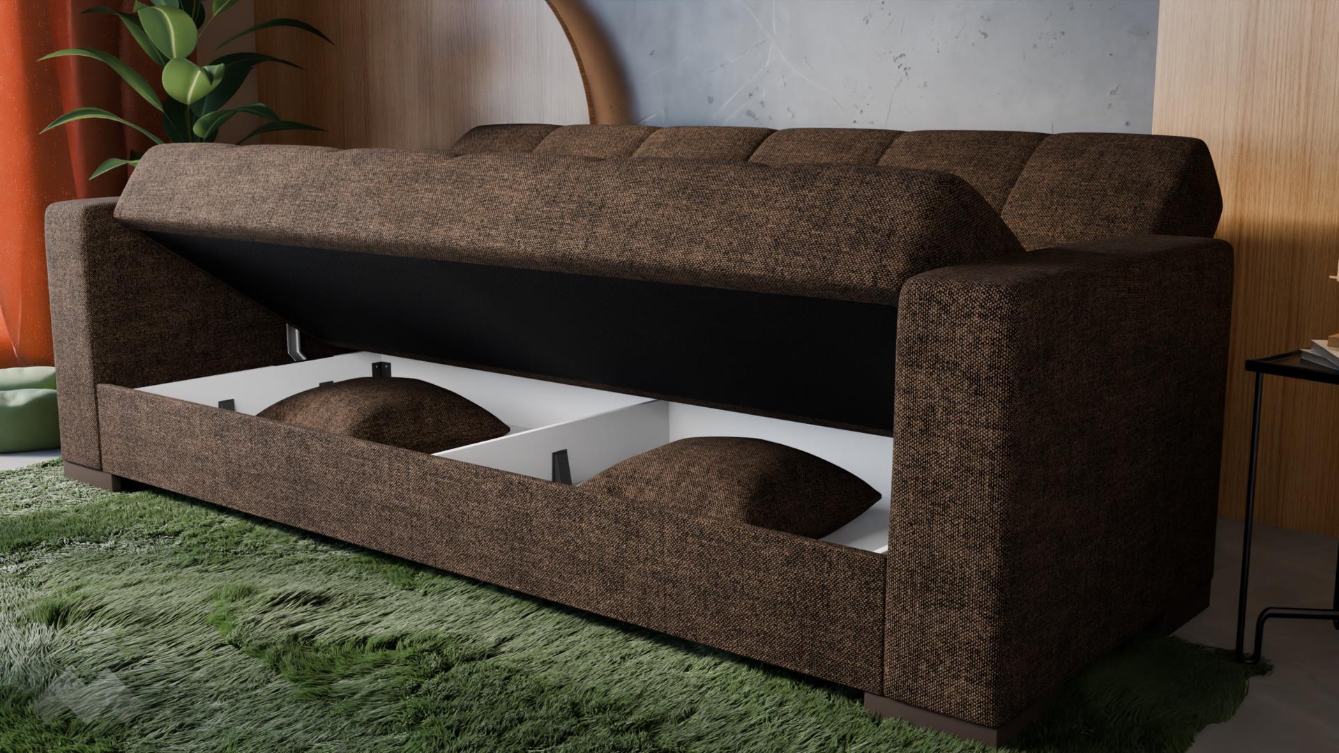 Диванът разполага с функция сън с размери 120/190 см, благодарение на надежден клик-клак механизъм, който позволява бързо и лесно трансформиране в удобно легло – практично решение за гости или ежедневно използване. Допълнително удобство е вградената ракла за съхранение, идеална за спално бельо, одеяла и възглавници.