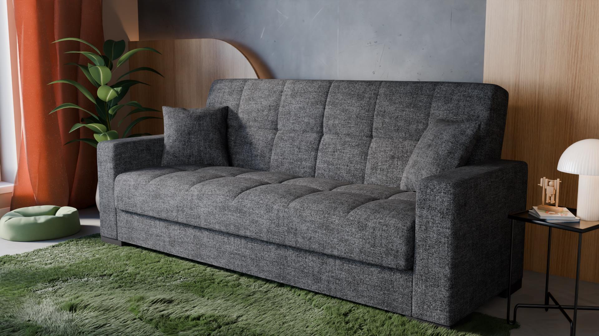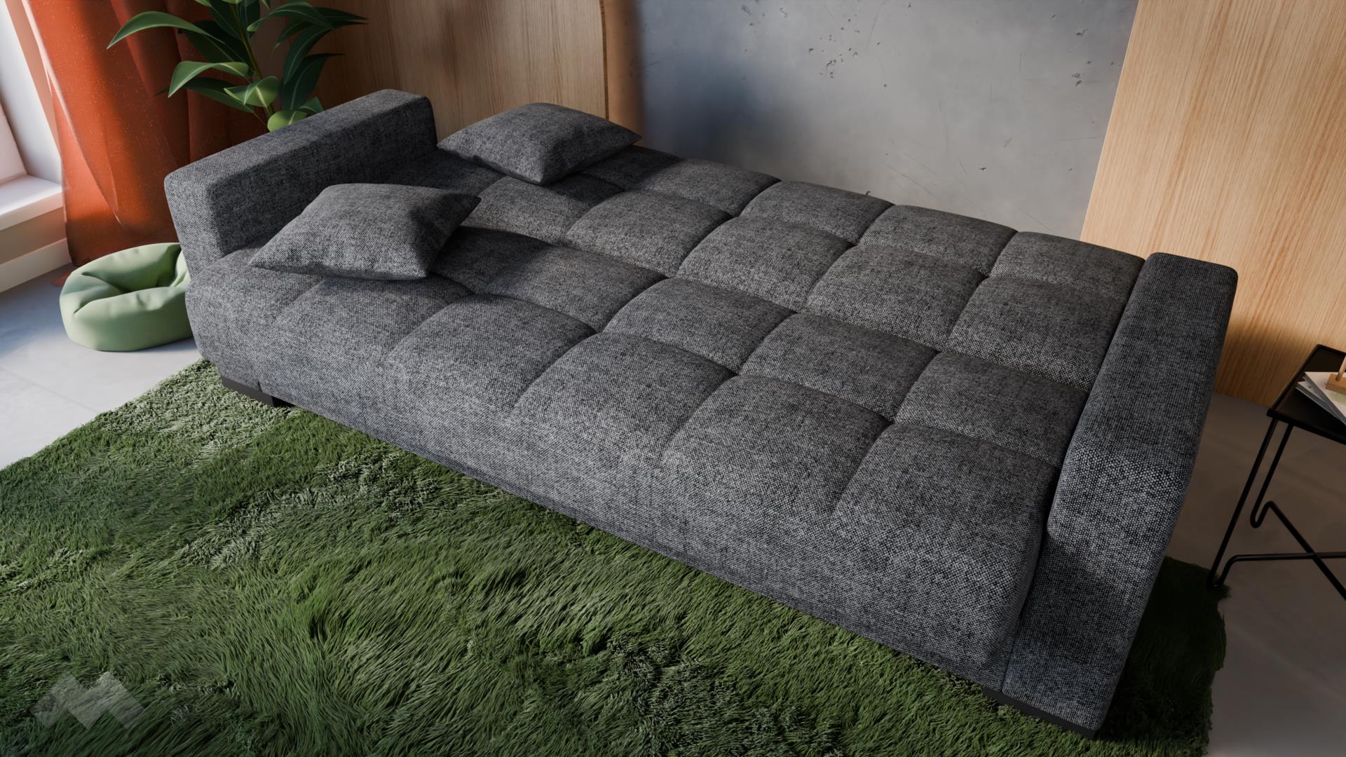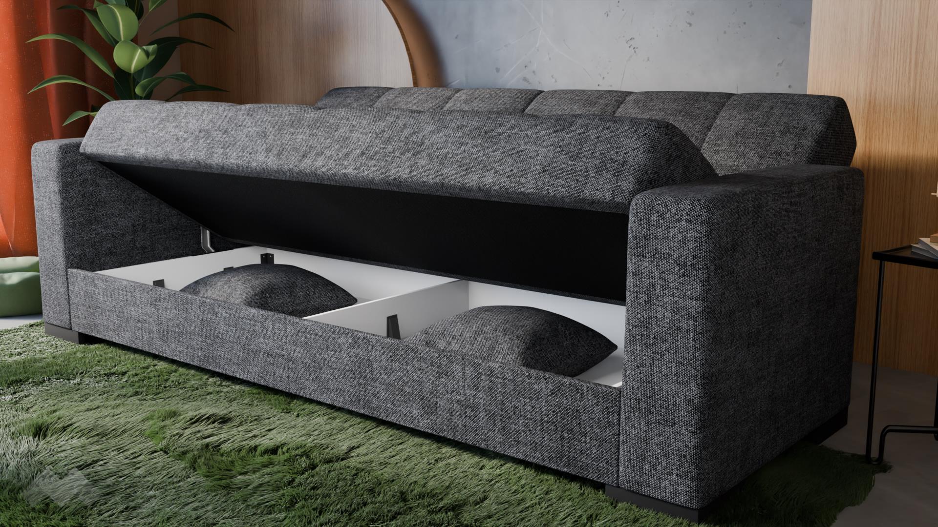 Диванът разполага с функция сън с размери 120/190 см, благодарение на надежден клик-клак механизъм, който позволява бързо и лесно трансформиране в удобно легло – практично решение за гости или ежедневно използване. Допълнително удобство е вградената ракла за съхранение, идеална за спално бельо, одеяла и възглавници.