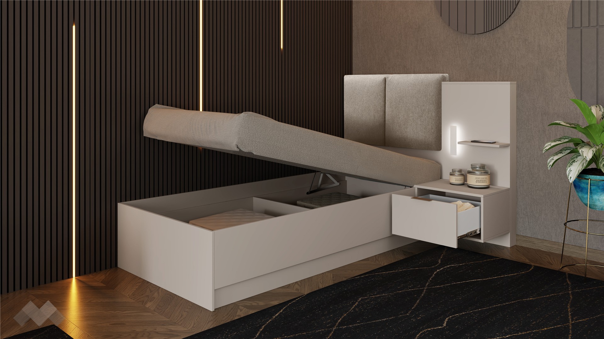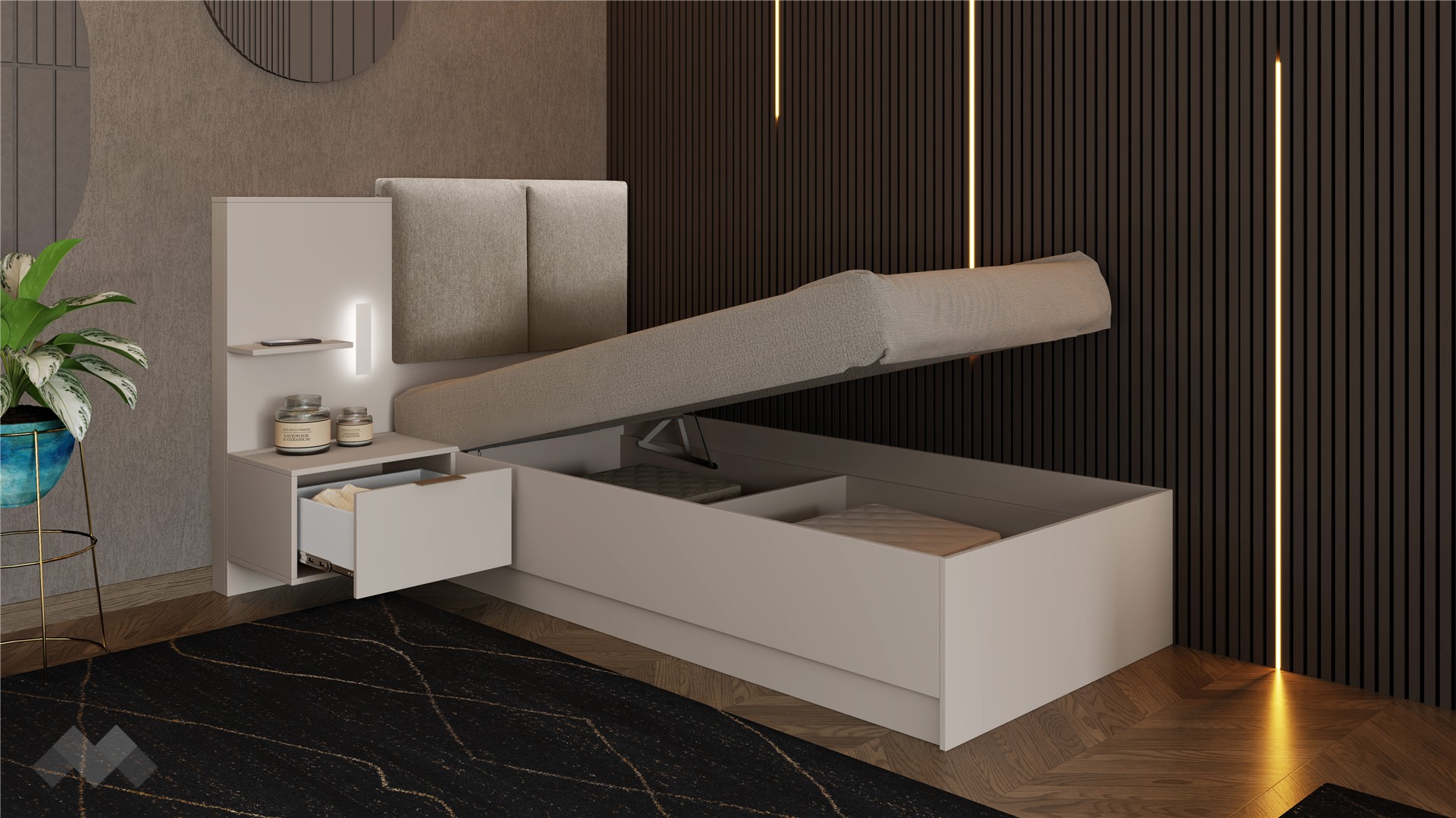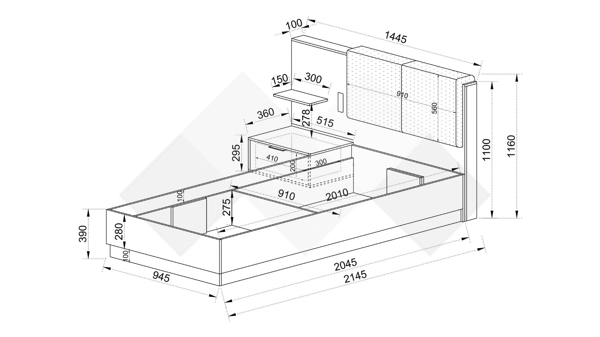Леглото разполага с удобен рафт и чекмедже, които осигуряват място за всички дребни вещи, които искаш да ти бъдат под ръка – телефон, книга, очила, козметика или ароматни свещи. Чекмеджето е снабдено със сачмени водачи с пълно изтегляне, които осигуряват пълен достъп до съдържанието и гарантират дълготрайна устойчивост.