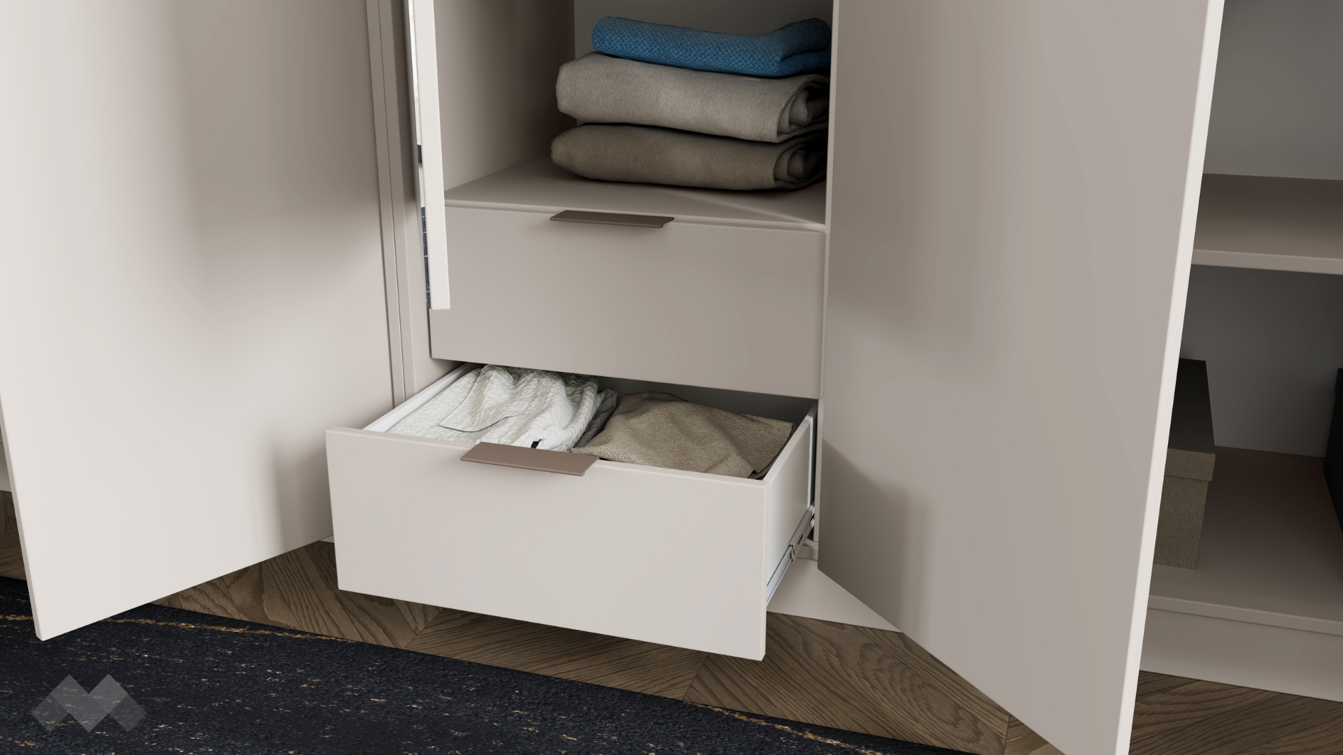 Моделът разполага и с две удобни чекмеджета, идеални за бельо, аксесоари или дребни вещи, които искаш да бъдат добре организирани. Чекмеджетата са снабдени със сачмени водачи с пълно изтегляне, които осигуряват пълен достъп до съдържанието и гарантират дълготрайна устойчивост.