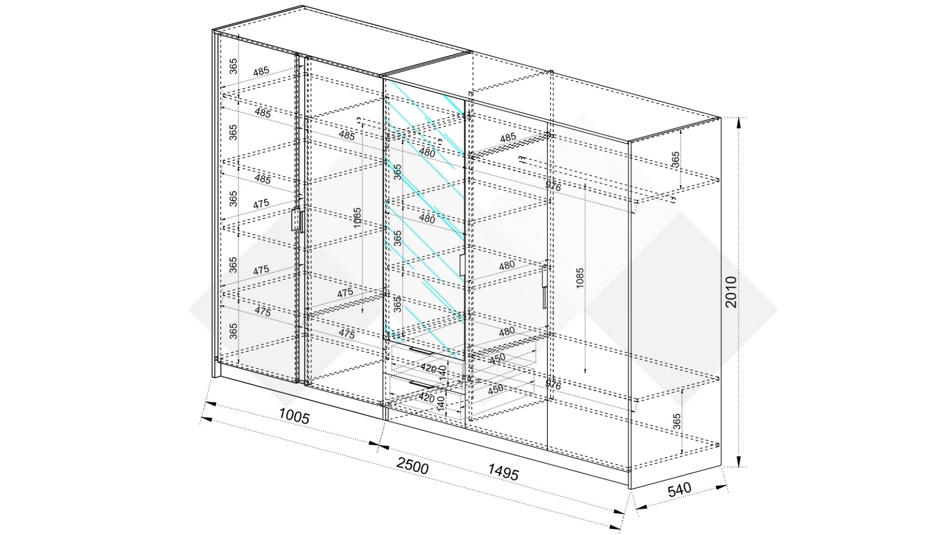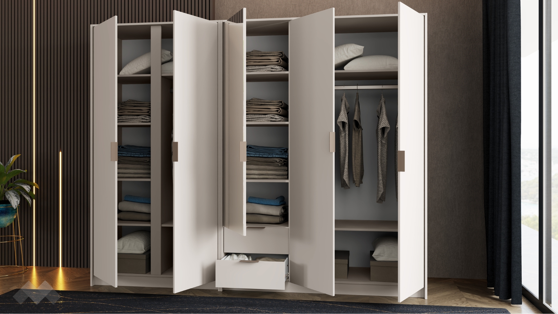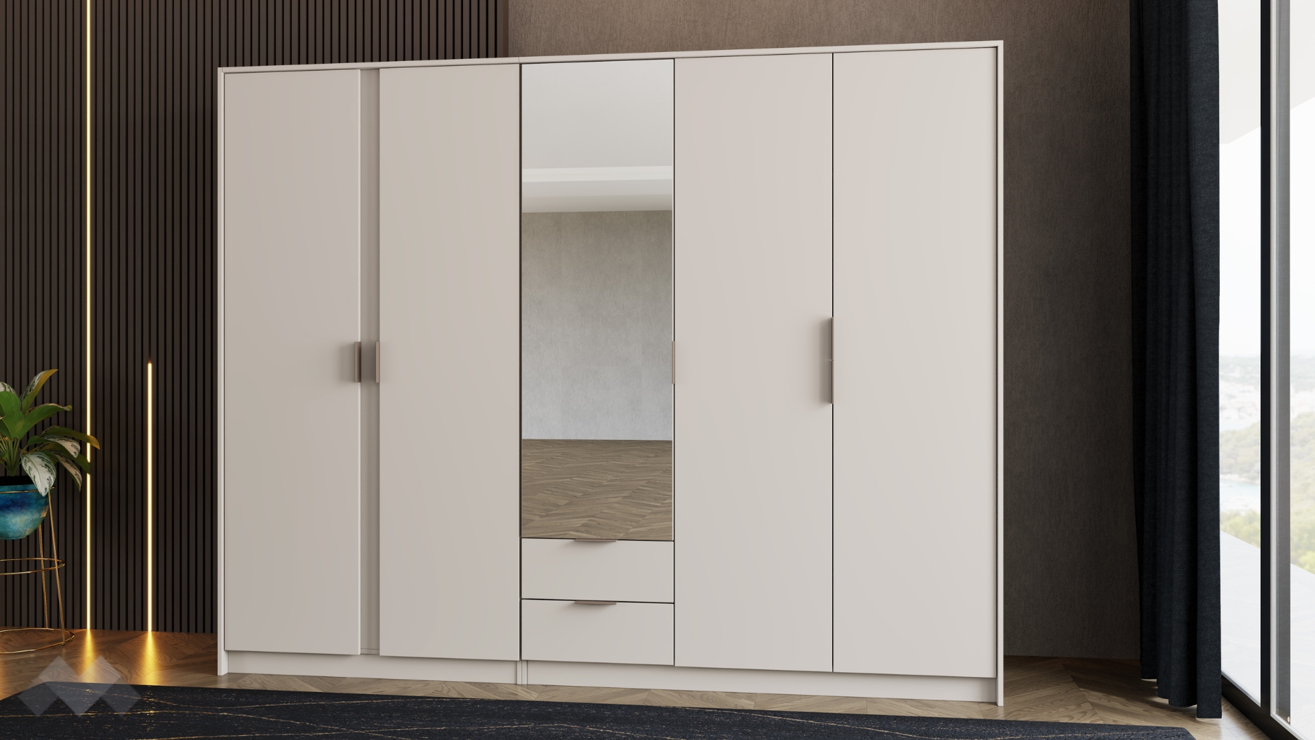 Създаден за максимално удобство и оптимална подредба, петкрилният гардероб Кашмир е идеалното решение, когато искаш пространство, което да побере всичко – от ежедневните дрехи до сезонните вещи.