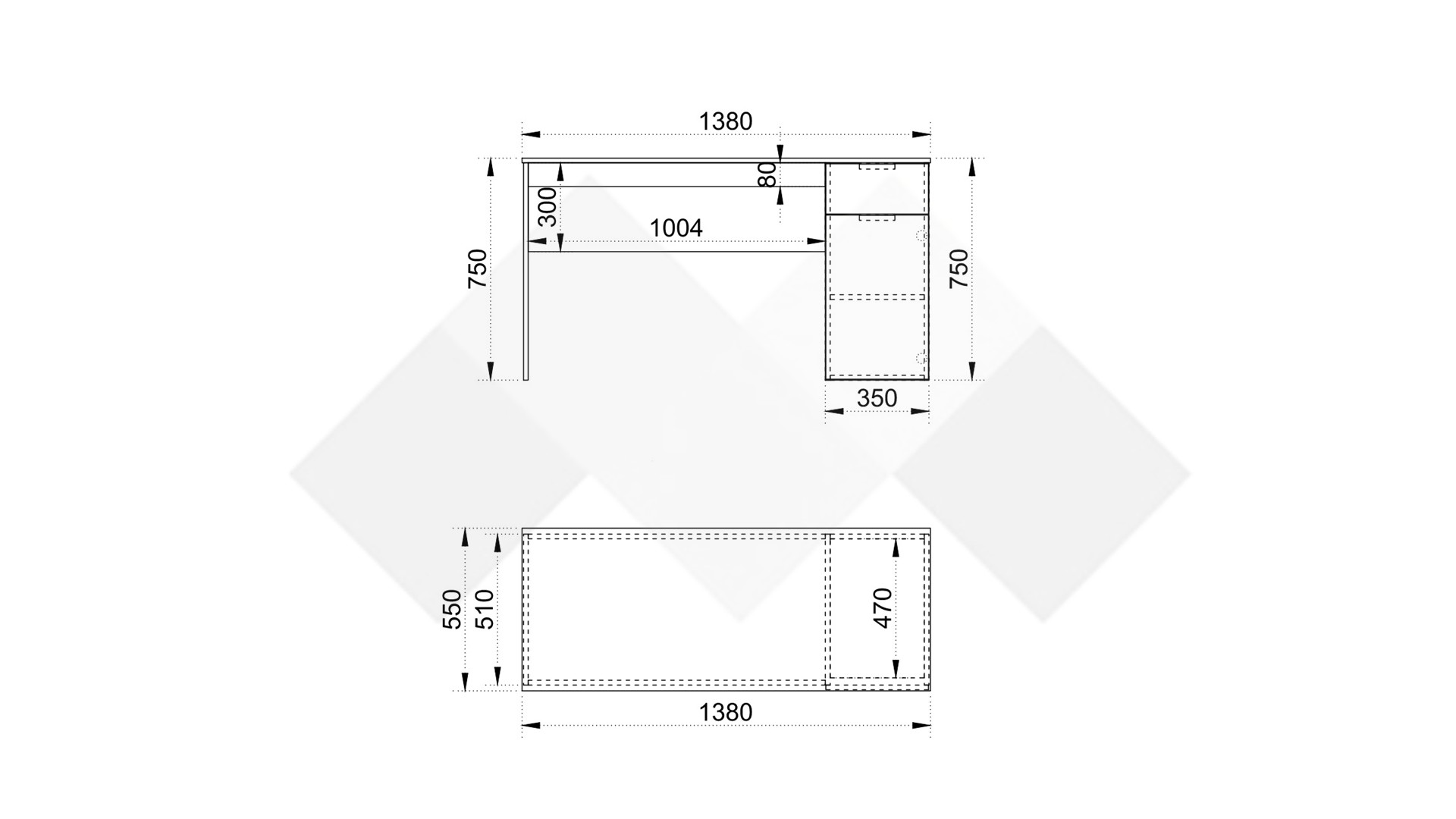 Под работния плот е разположено удобно чекмедже, в което можеш да поставиш най-необходимите документи или други вещи, а под него има затворен шкаф с рафт, подходящ за организиране на необходимите в работата инструменти и канцеларски материали. Чекмеджето е снабдено със сачмени водачи с пълно изтегляне, които осигуряват пълен достъп до съдържанието и гарантират дълготрайна устойчивост.