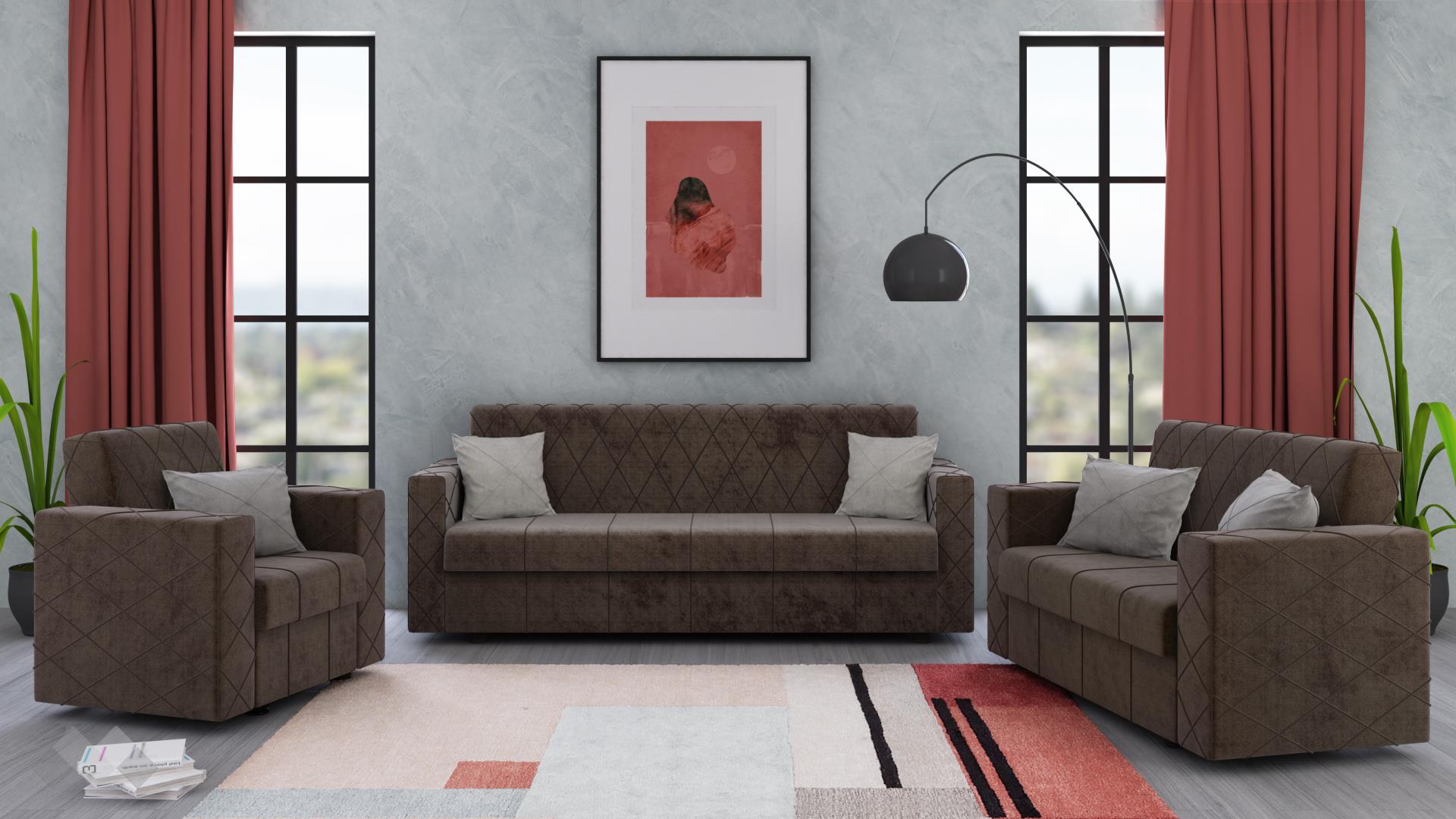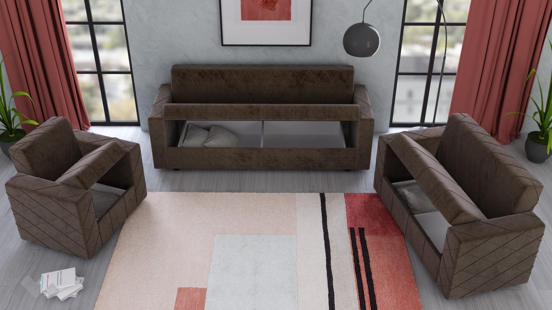 Семплият дизайн, перфектно допълнен от декоративни шевове във форма на геометрични фигури, е подходящ за всеки интериор. С едно издърпване се активира функция сън и триместният диван се превръща в практично легло. Двуместният диван и фотьойлът също могат да ти предложат повече пространство за релакс, тъй като и те са снабдени с клик-клак механизъм. Клик-клак механизмът е изключително лесен за ползване – просто издърпваш, повдигаш седалката и вече разполагаш с повече площ. В корпусната част на всеки модул е скрита ракла, готова да приюти твои вещи.