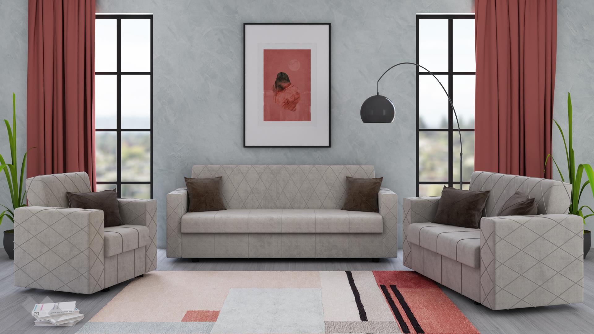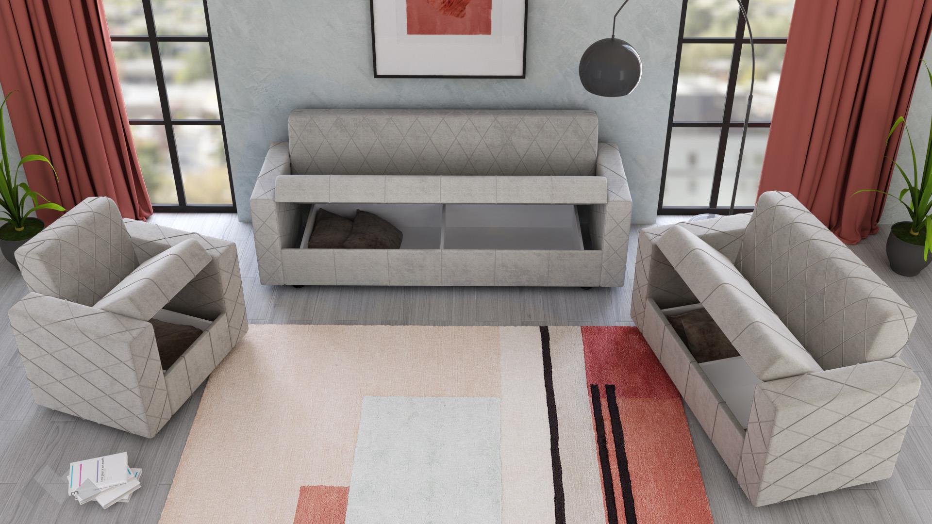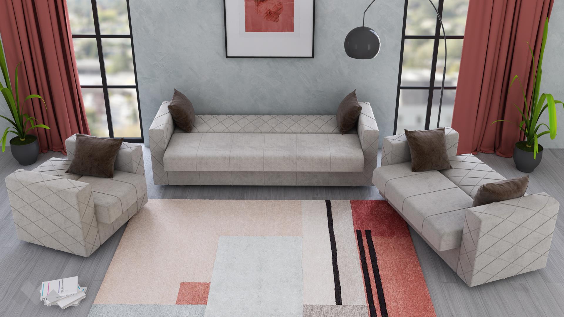 Семплият дизайн, перфектно допълнен от декоративни шевове във форма на геометрични фигури, е подходящ за всеки интериор. С едно издърпване се активира функция сън и триместният диван се превръща в практично легло. Двуместният диван и фотьойлът също могат да ти предложат повече пространство за релакс, тъй като и те са снабдени с клик-клак механизъм. Клик-клак механизмът е изключително лесен за ползване – просто издърпваш, повдигаш седалката и вече разполагаш с повече площ. В корпусната част на всеки модул е скрита ракла, готова да приюти твои вещи.