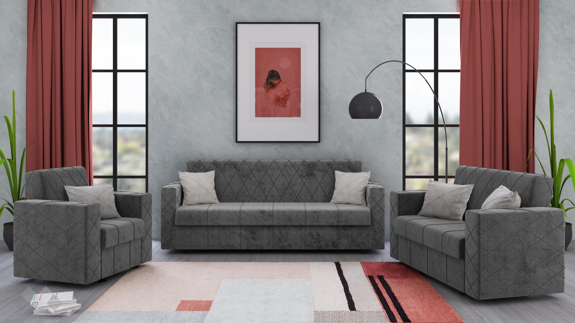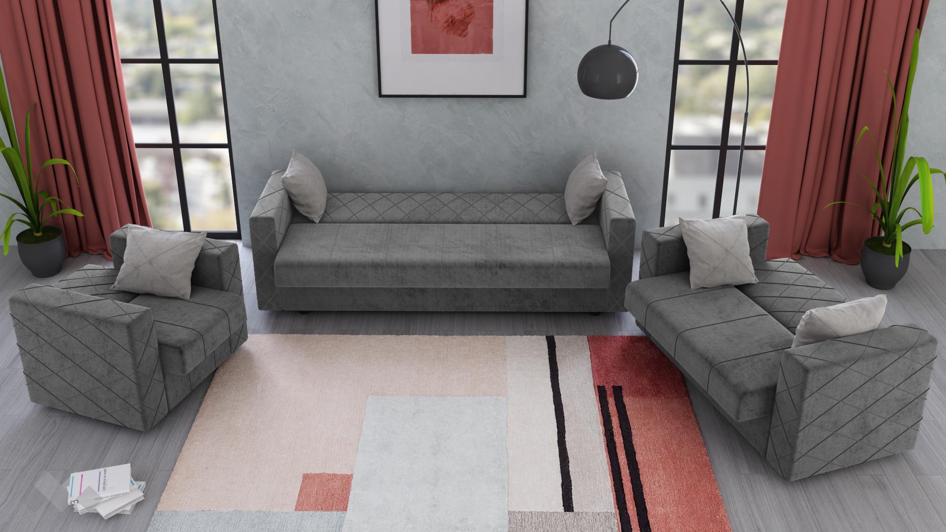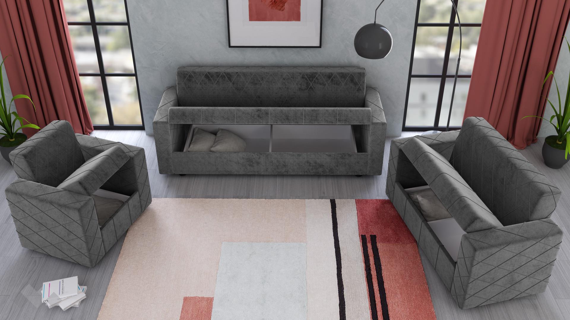 Семплият дизайн, перфектно допълнен от декоративни шевове във форма на геометрични фигури, е подходящ за всеки интериор. С едно издърпване се активира функция сън и триместният диван се превръща в практично легло. Двуместният диван и фотьойлът също могат да ти предложат повече пространство за релакс, тъй като и те са снабдени с клик-клак механизъм. Клик-клак механизмът е изключително лесен за ползване – просто издърпваш, повдигаш седалката и вече разполагаш с повече площ. В корпусната част на всеки модул е скрита ракла, готова да приюти твои вещи.