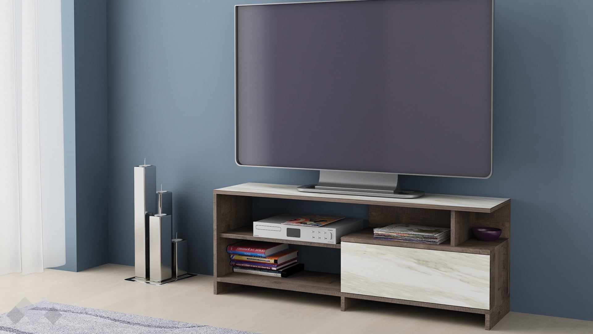 На твое разположение са два рафта, затворен шкаф и удобен плот, на който можеш да поставиш своя телевизор. Рафтовете ти предоставят достатъчно пространство, където да поставиш цялата си съпътстваща техника като ТВ приемници, конзоли и други. В затворения шкаф можеш да организираш вещите, които искаш да останат скрити, или техника, която не използваш толкова често, но в същото време ще ти е винаги под ръка.